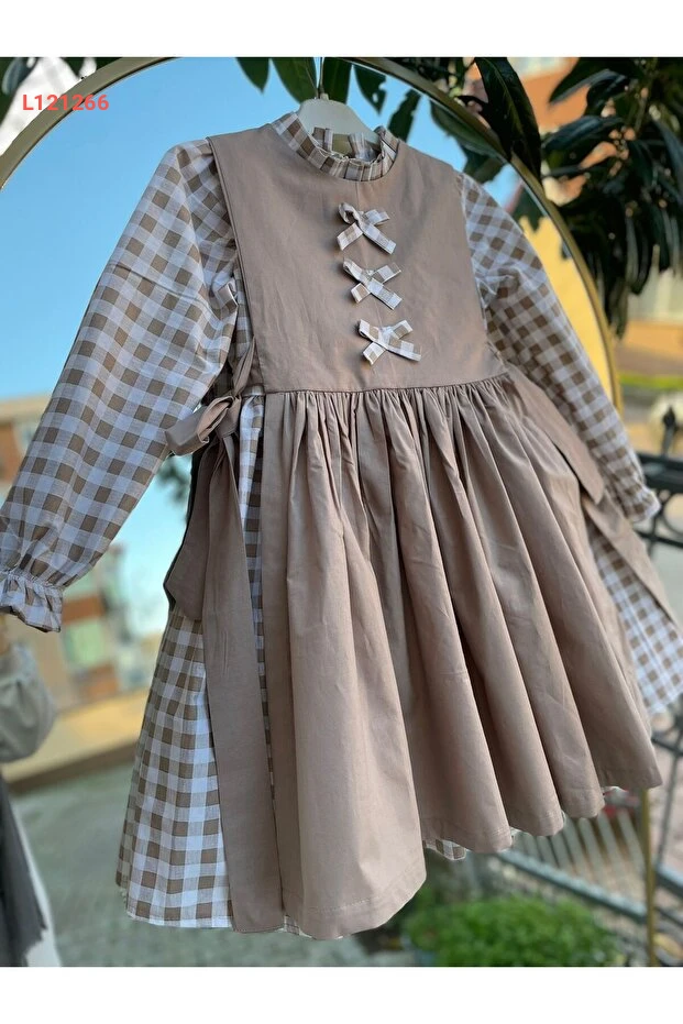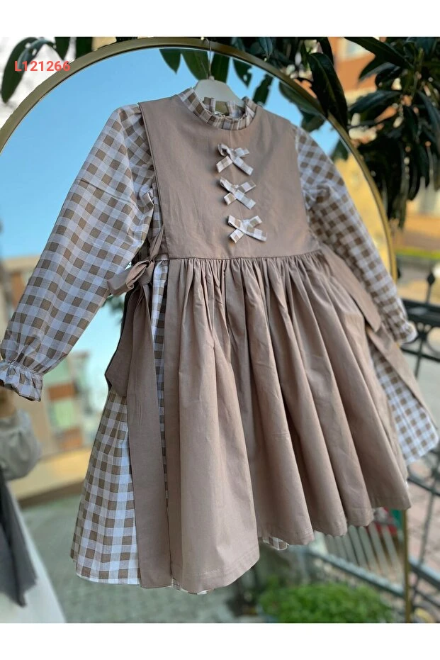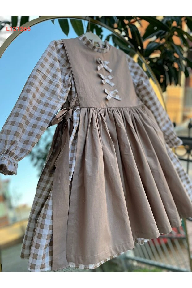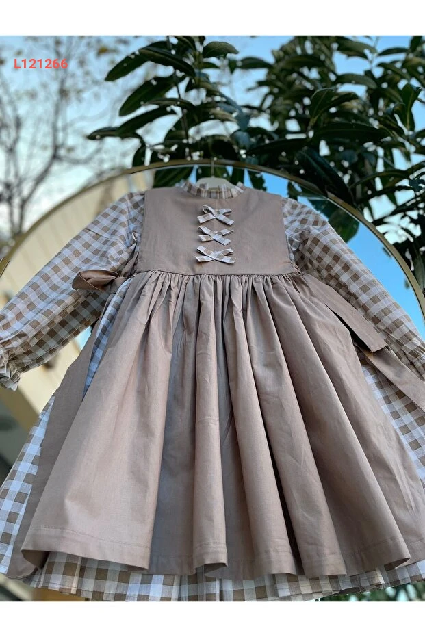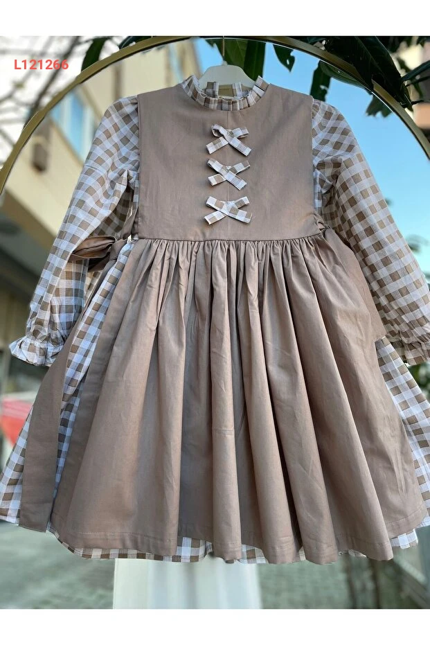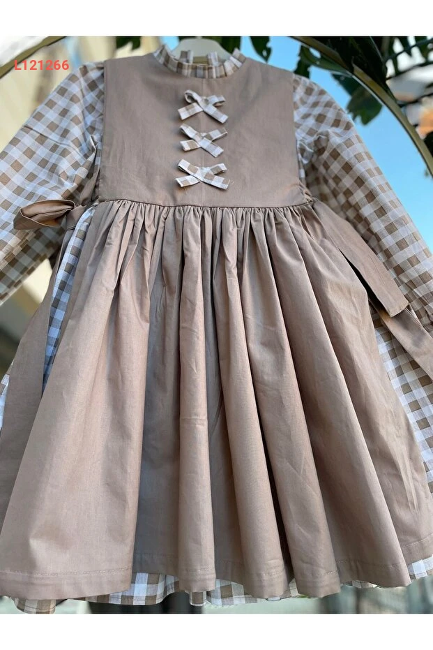فستان بناتي من قطن بوبلين بني مربعات مزين بالأربطة الجانبية