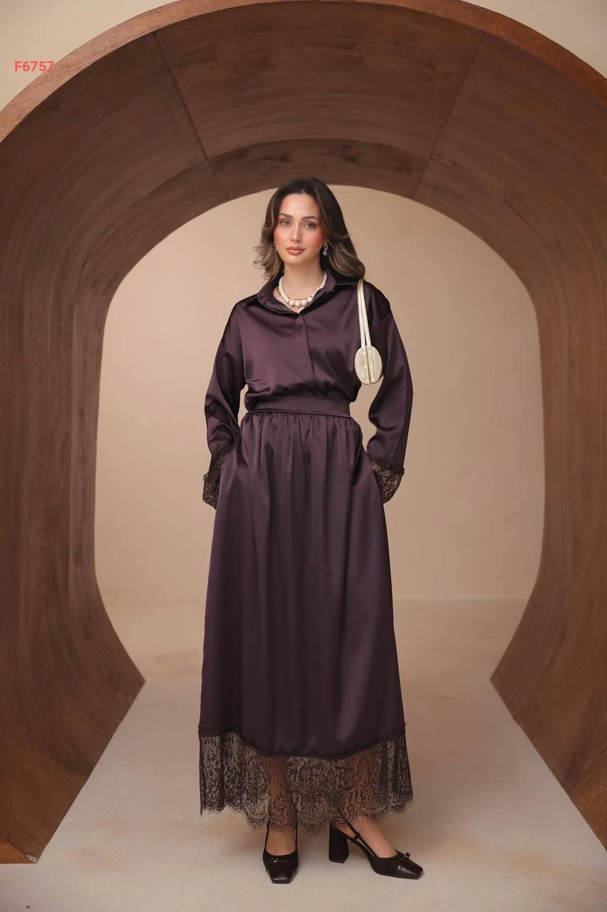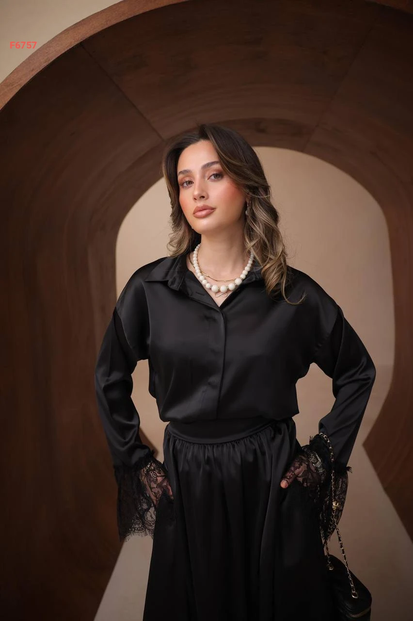 طقم تنورة ساتان ودانتيل مع قميص