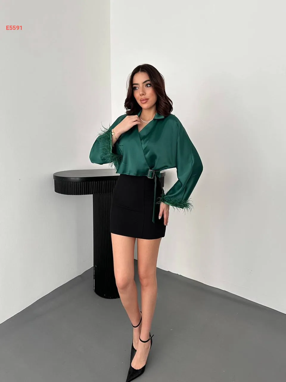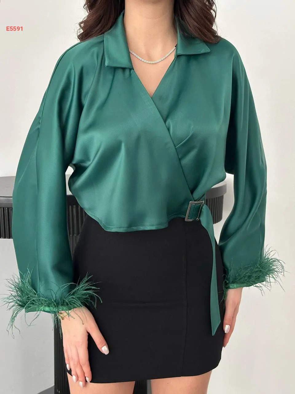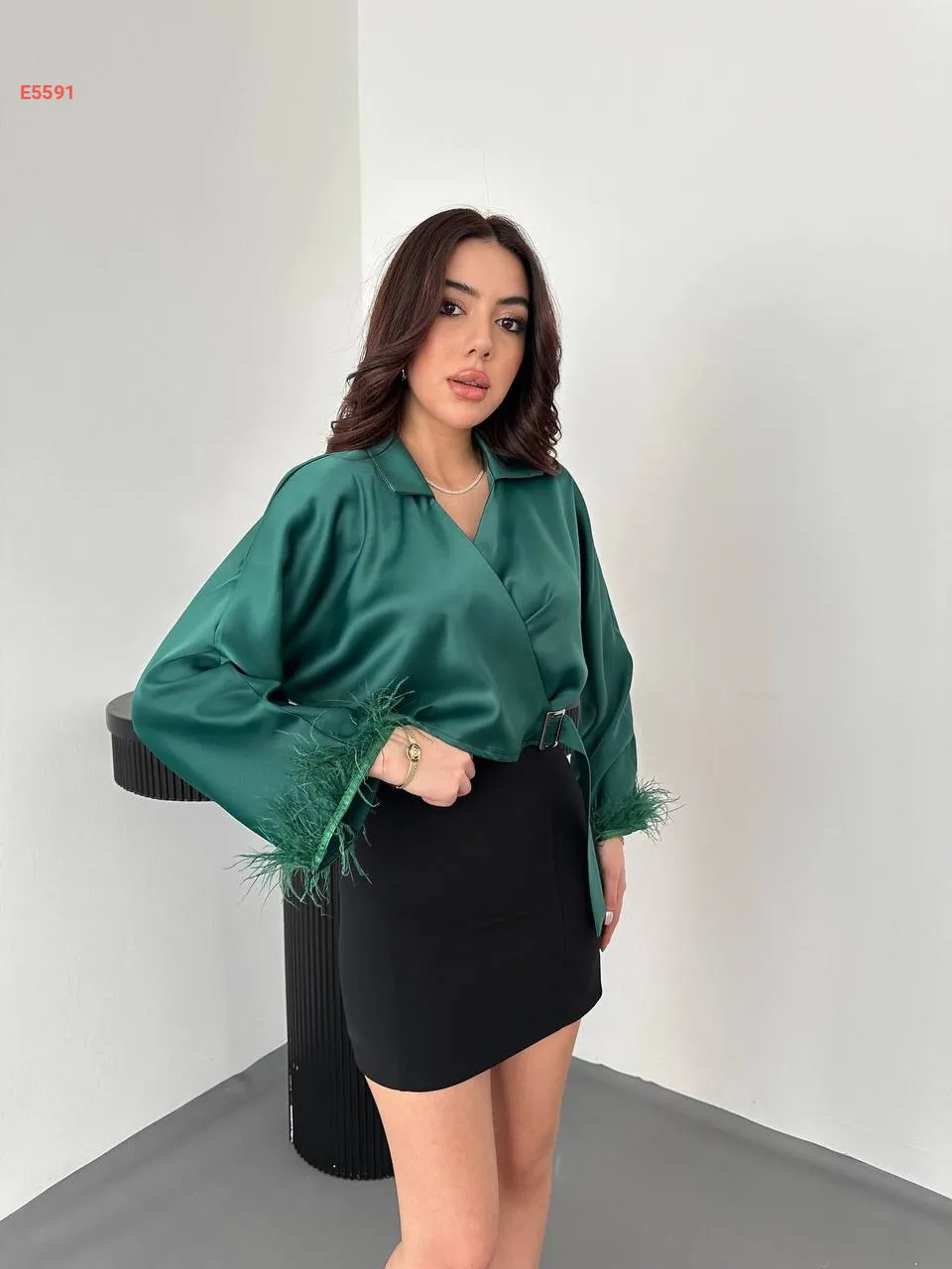 بلوزة ساتان لف بإبزيم وريش عالأكمام