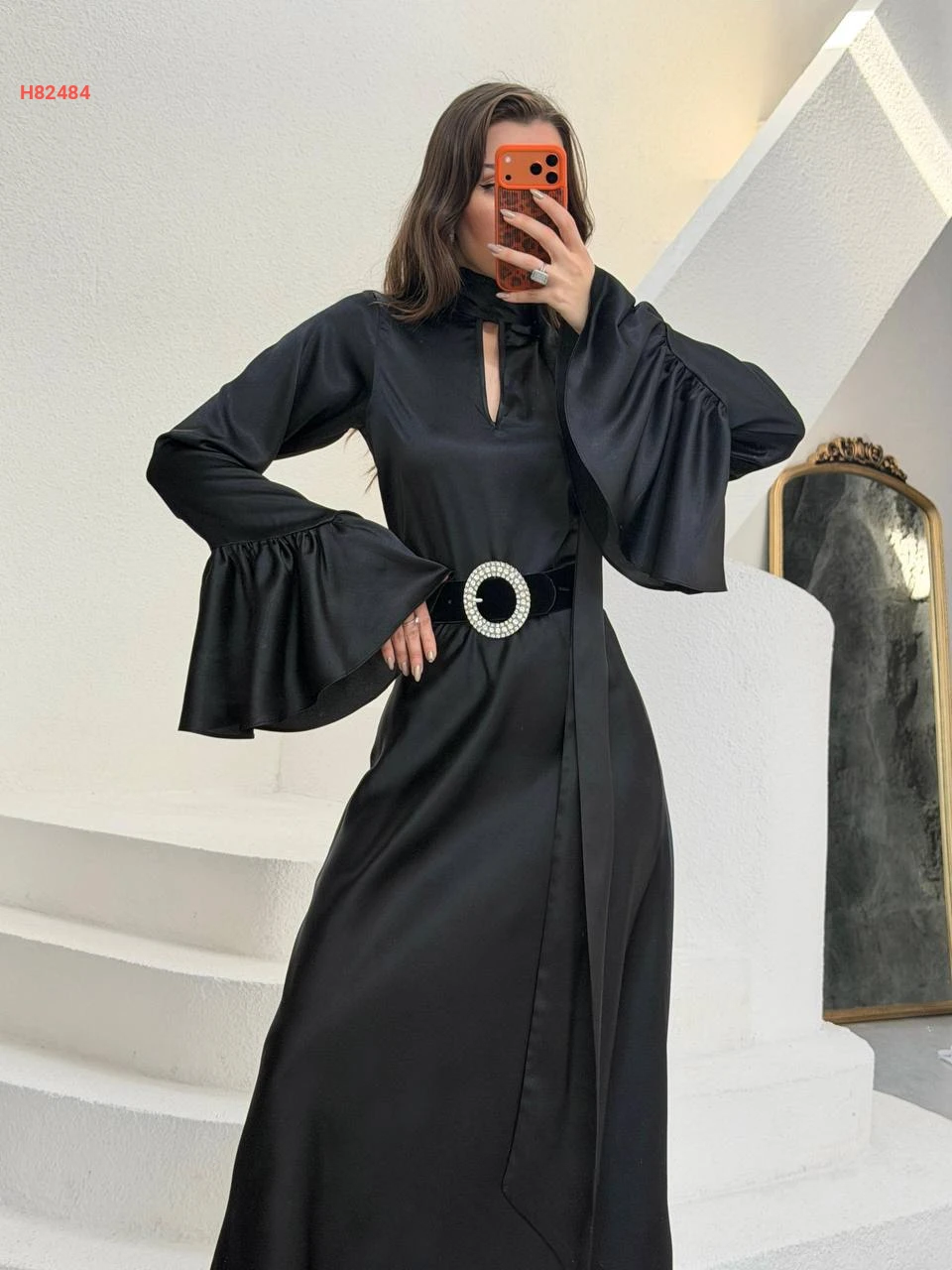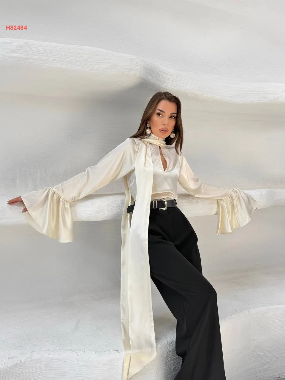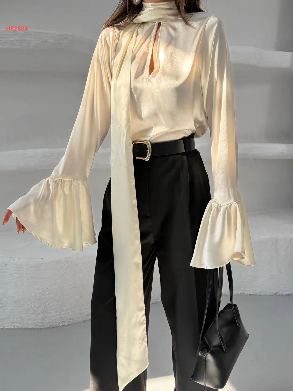 بلوزة ساتان بأكمام كلوش وفولار