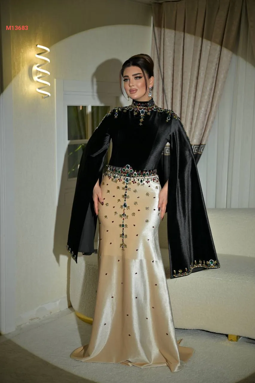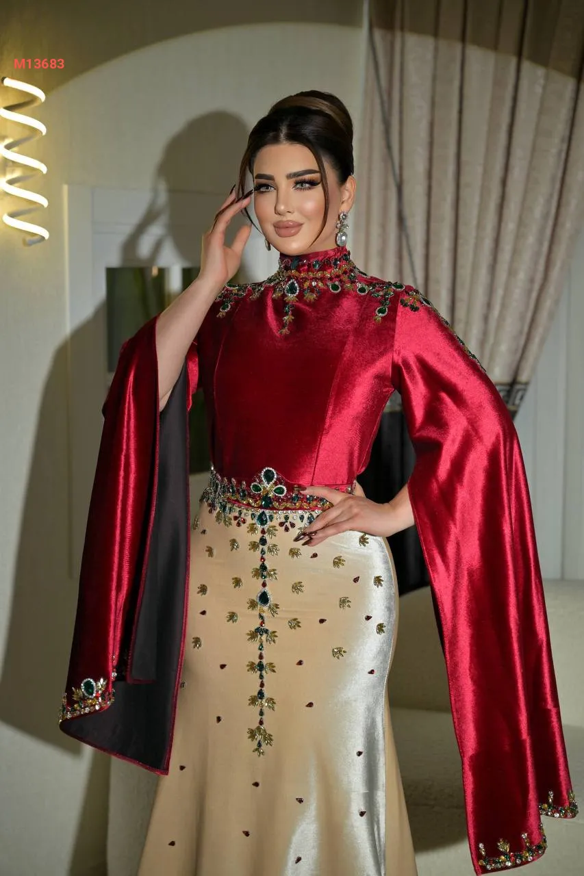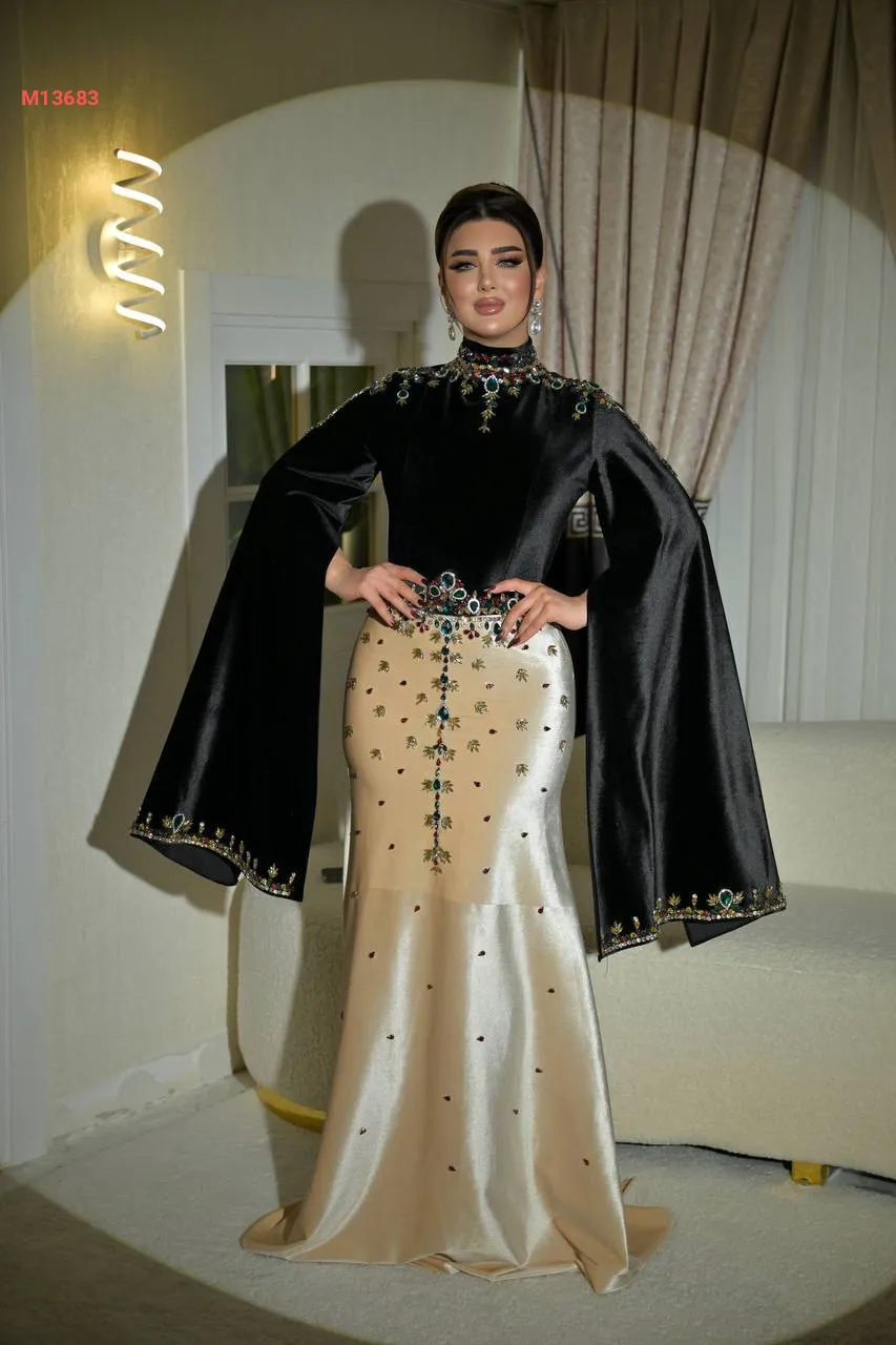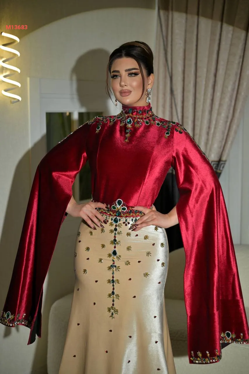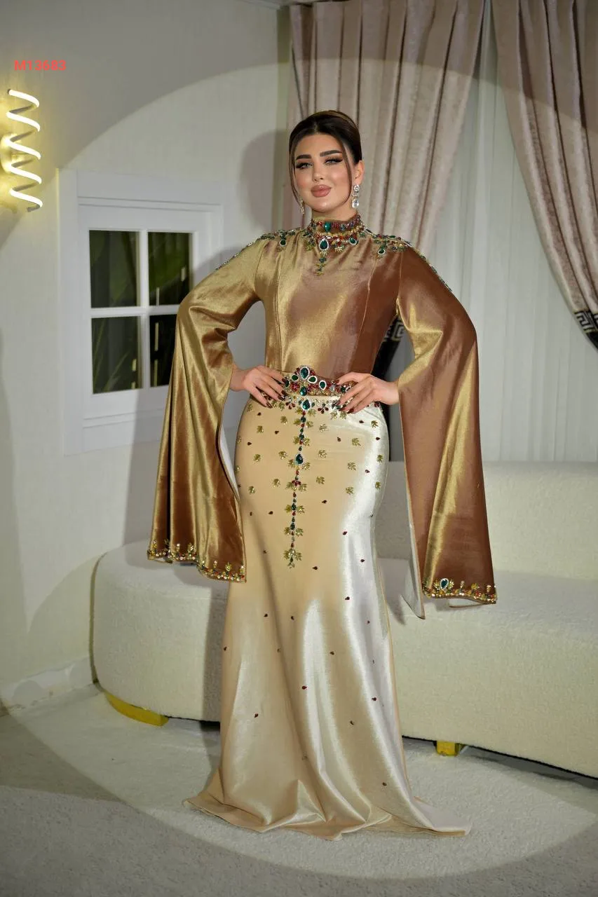 فستان سهرة بأكمام ساتان ياقة مدورة مرصعة بالكريستال مع الخصر