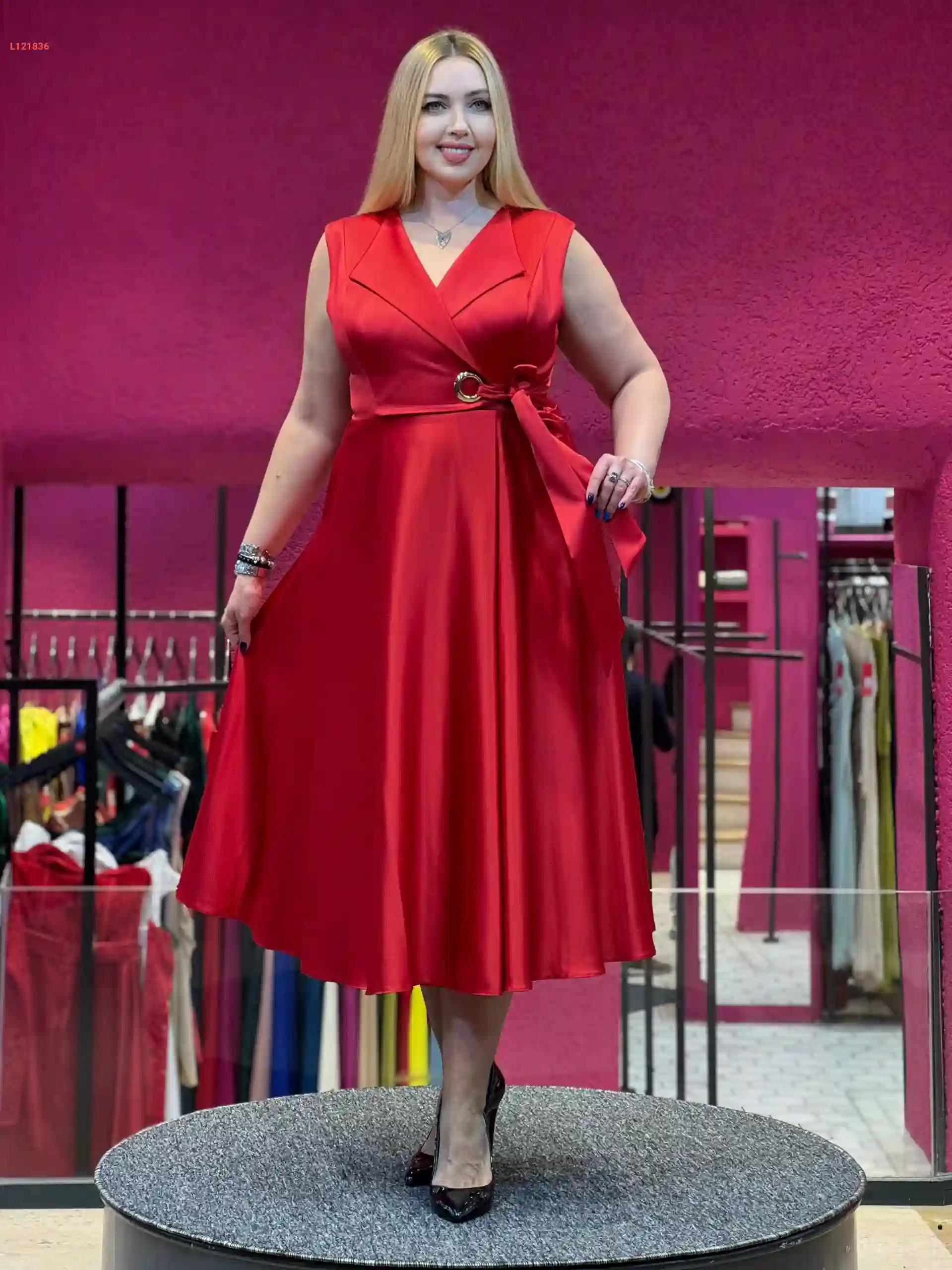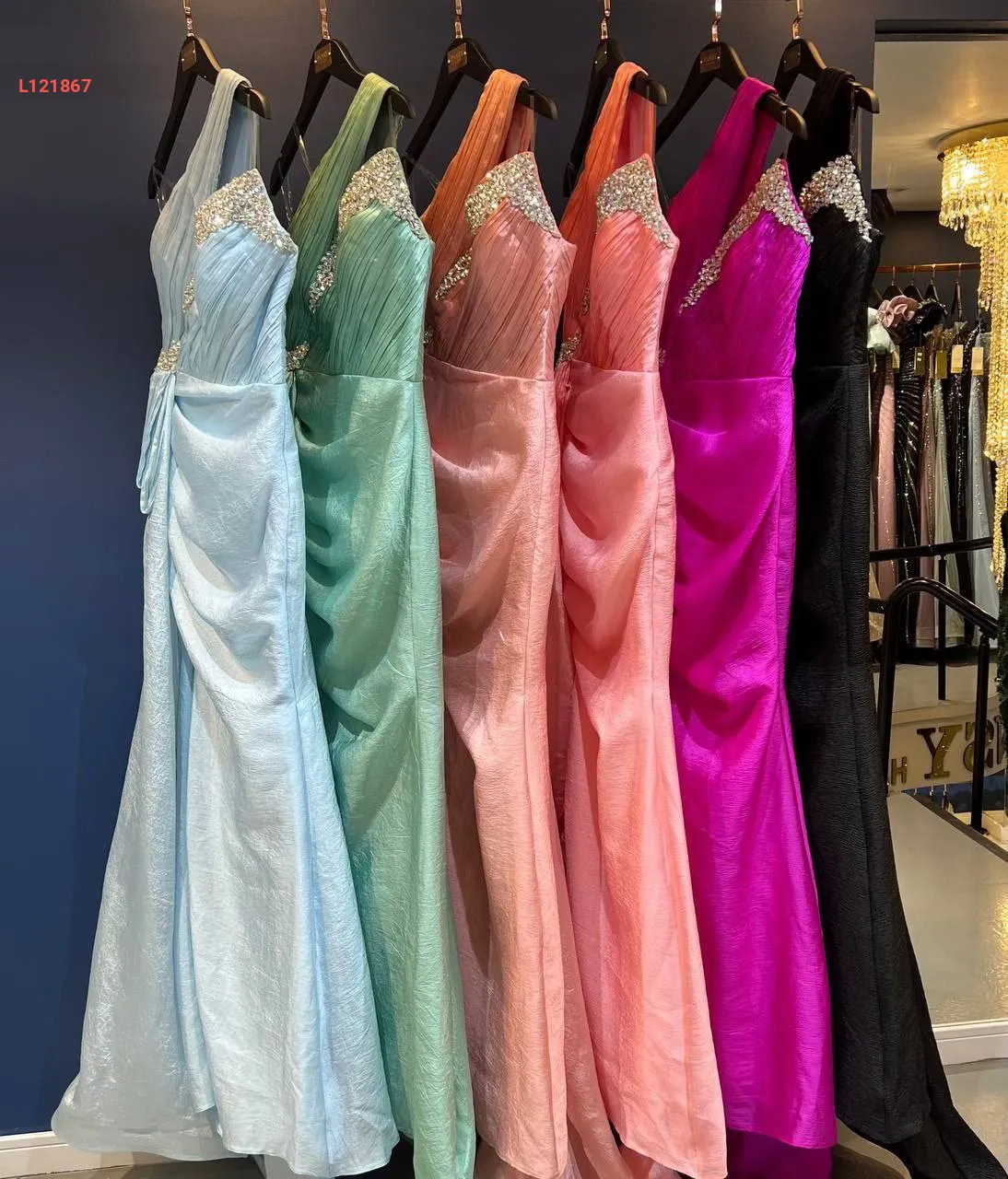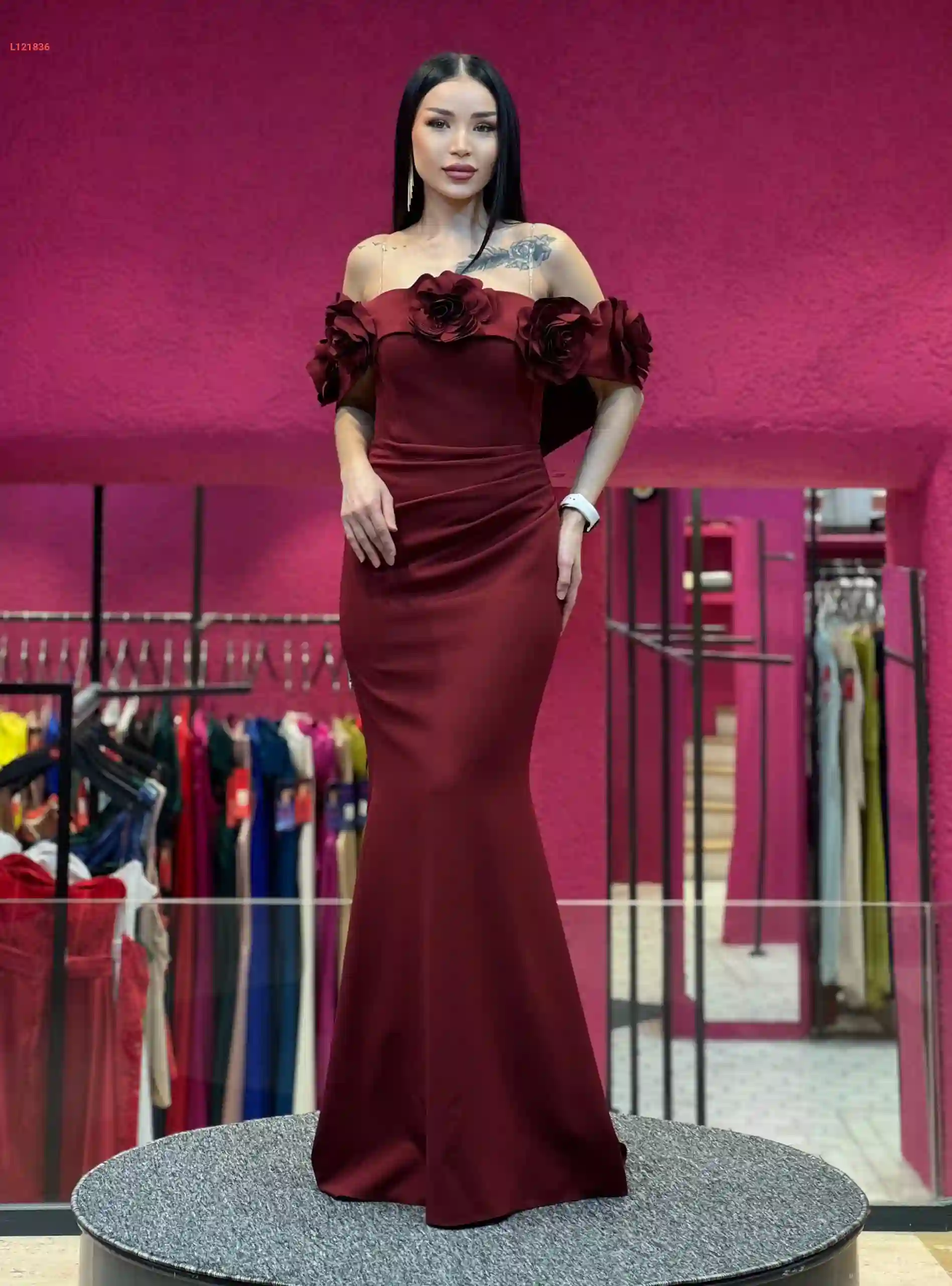 فستان سهرة ساتان مكشوف الكتف والظهر مع موديل عند الخصر، مرصعة بالالماس عند الصدر