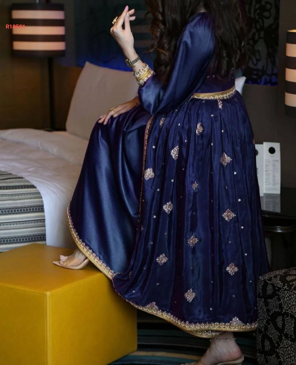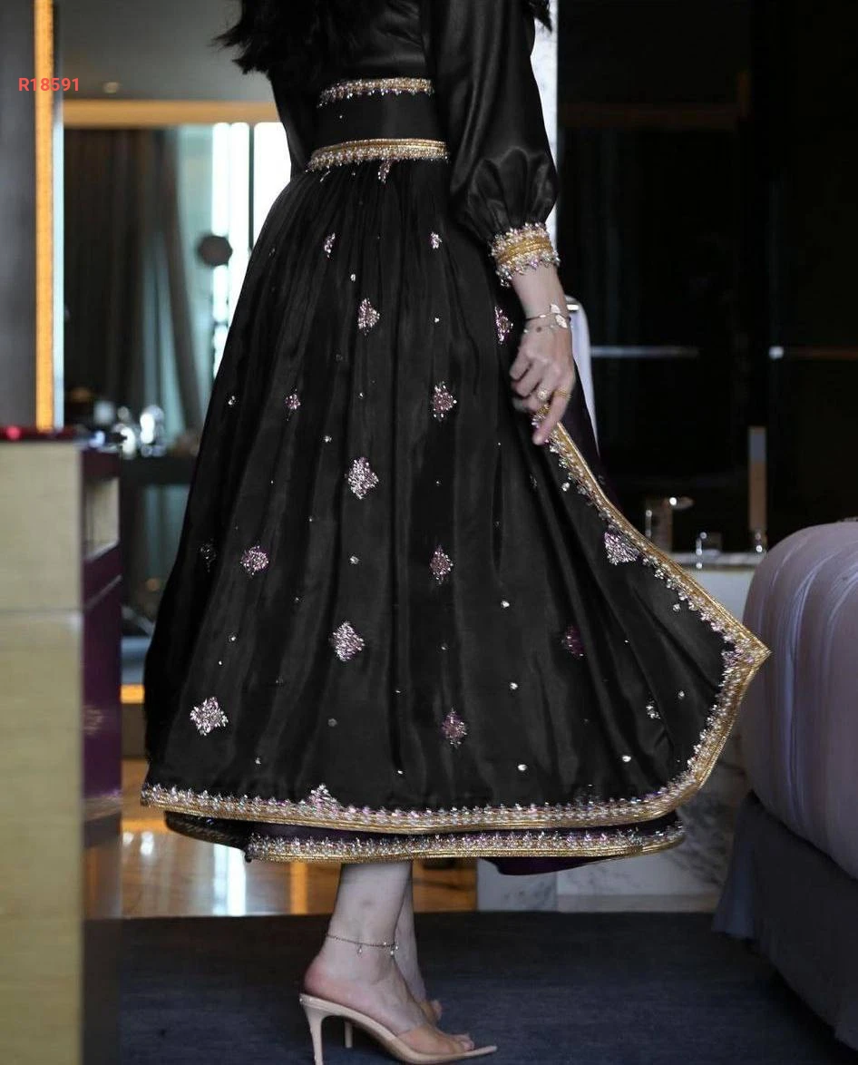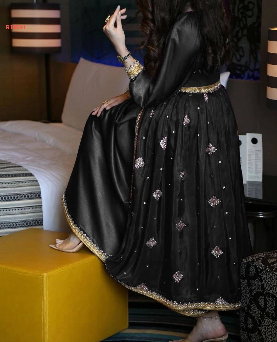 فستان سواريه كلوش من الساتان مع تنورة ربط عند الخصر مطرز شك خرز وبرق