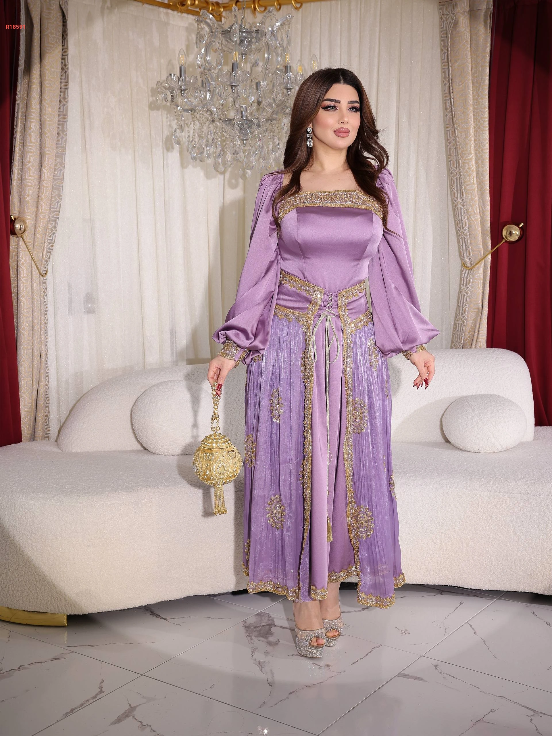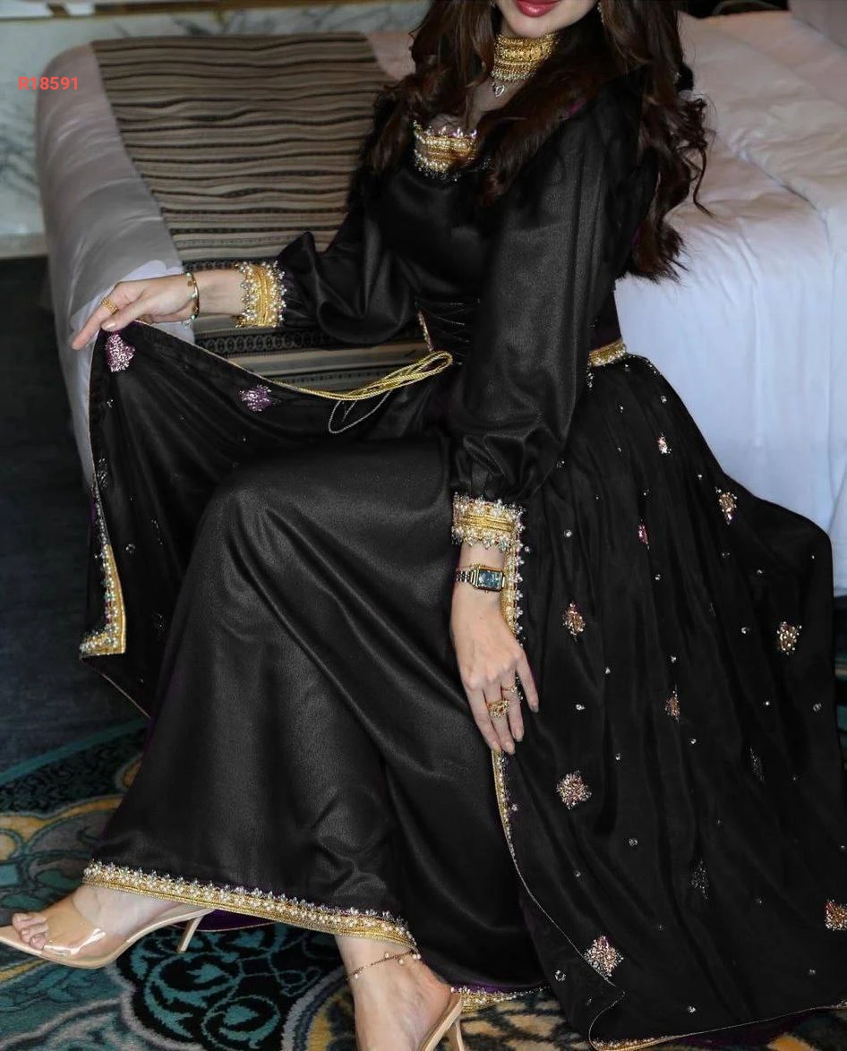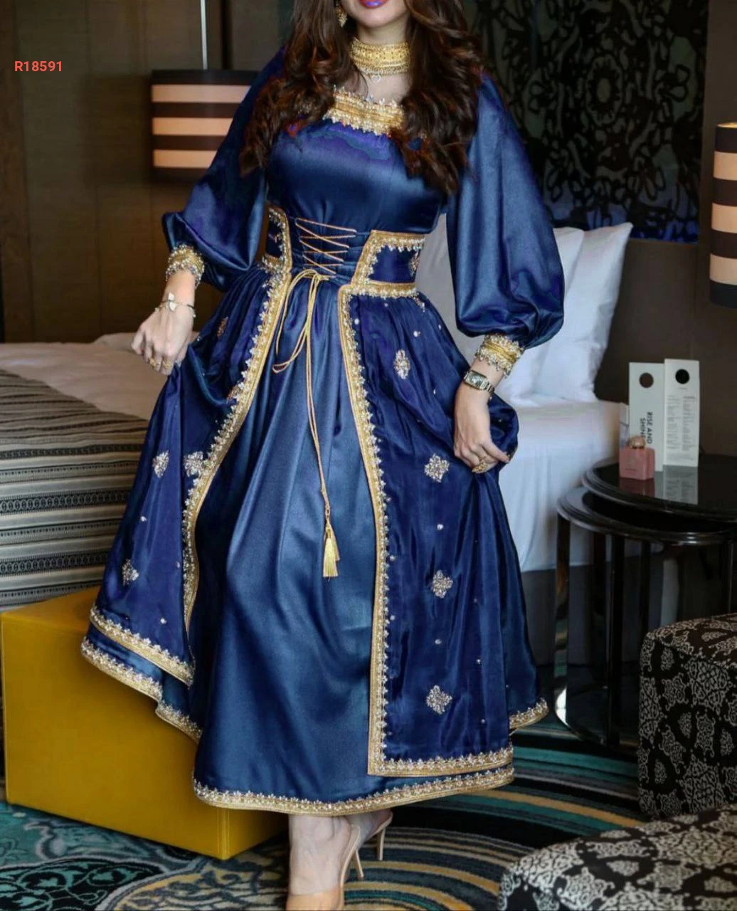 فستان سواريه كلوش من الساتان مع تنورة ربط عند الخصر مطرز شك خرز وبرق