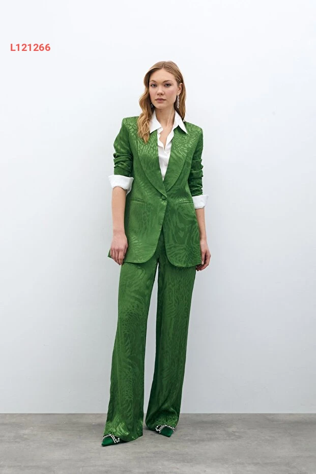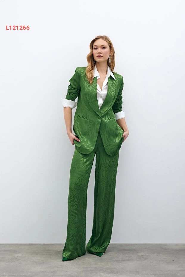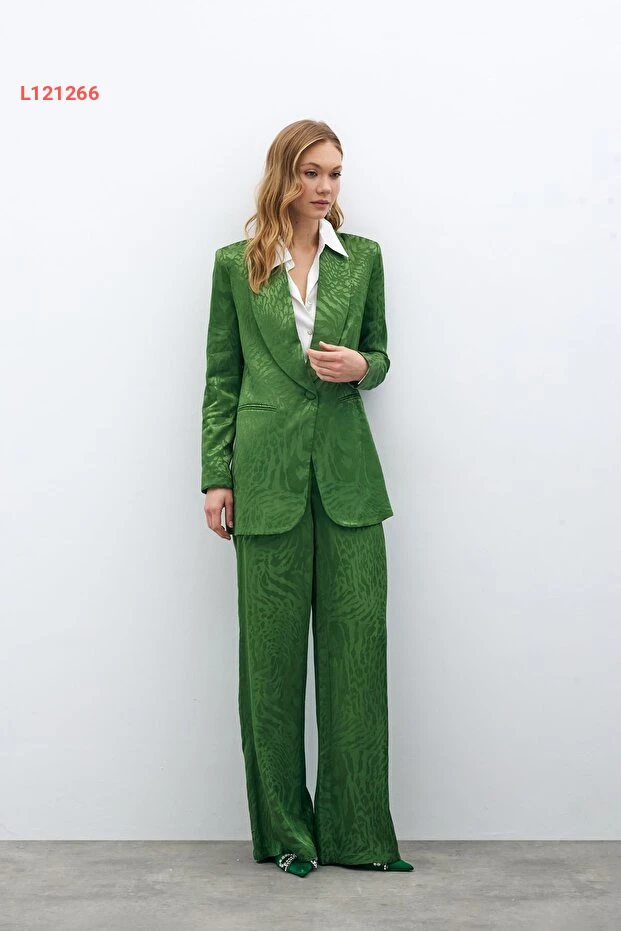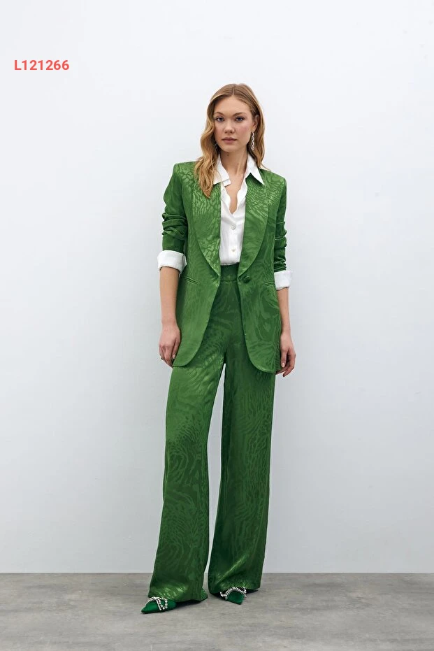 تمتع بإطلالة أنيقة وعصرية مع بنطلون ساتين مزخرف باللون الأخضر. يتميز هذا البنطلون بقماشه الناعم الذي يوفر الراحة طوال اليوم، بينما يضفي التصميم المزخرف لمسة من الجاذبية الفريدة. مثالي للمناسبات الرسمية وغير الرسمية، سيصبح خيارك المفضل لإكمال أي طلة.
