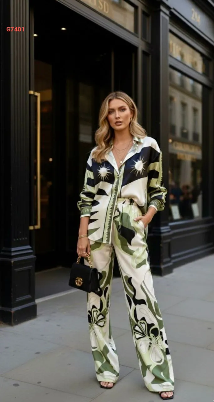 طقم بنطال ساتان منقوش مع قميص
