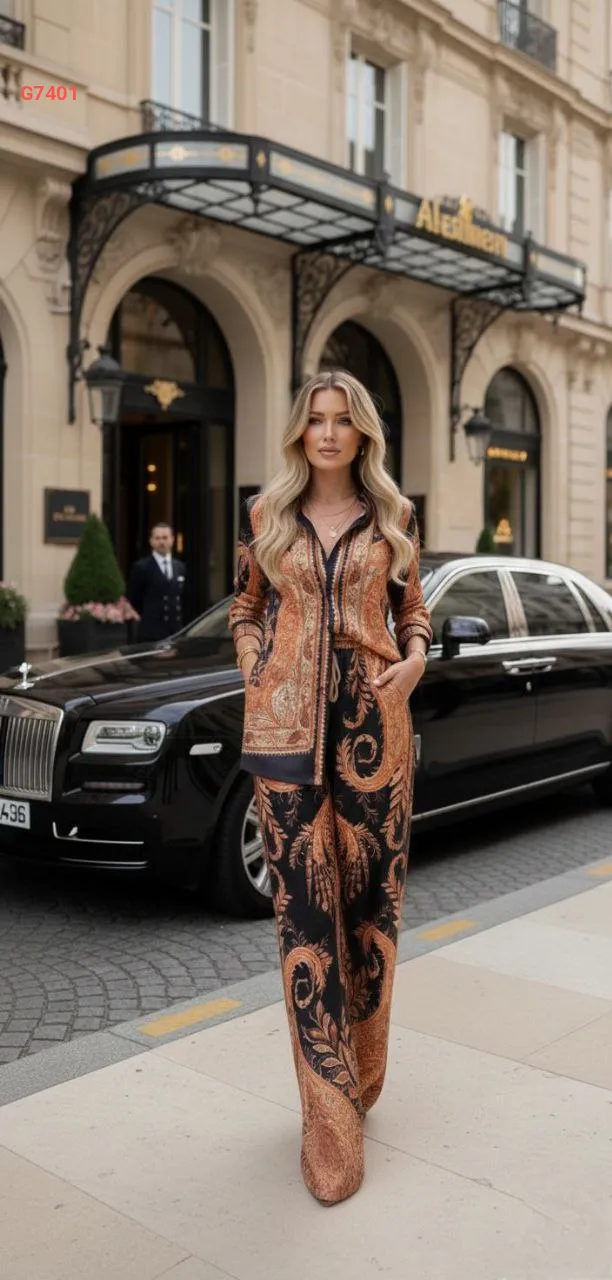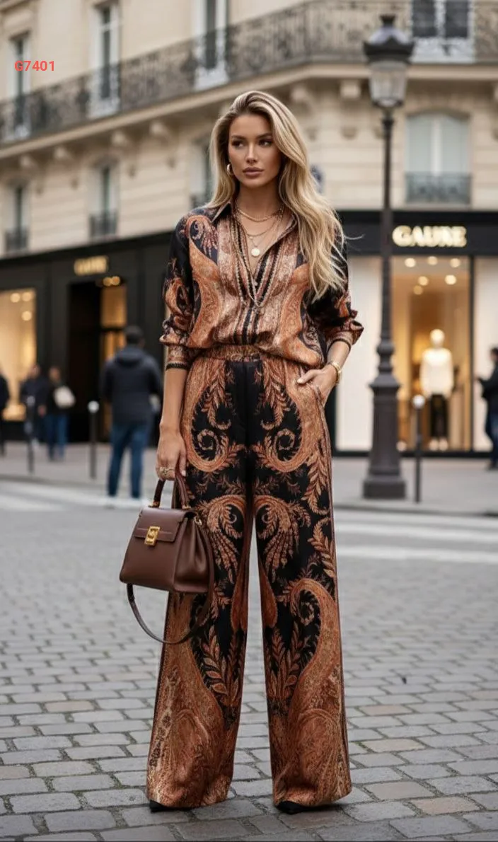 طقم بنطال ساتان منقوش مع قميص