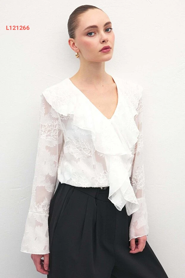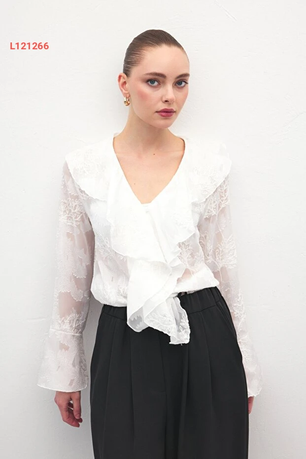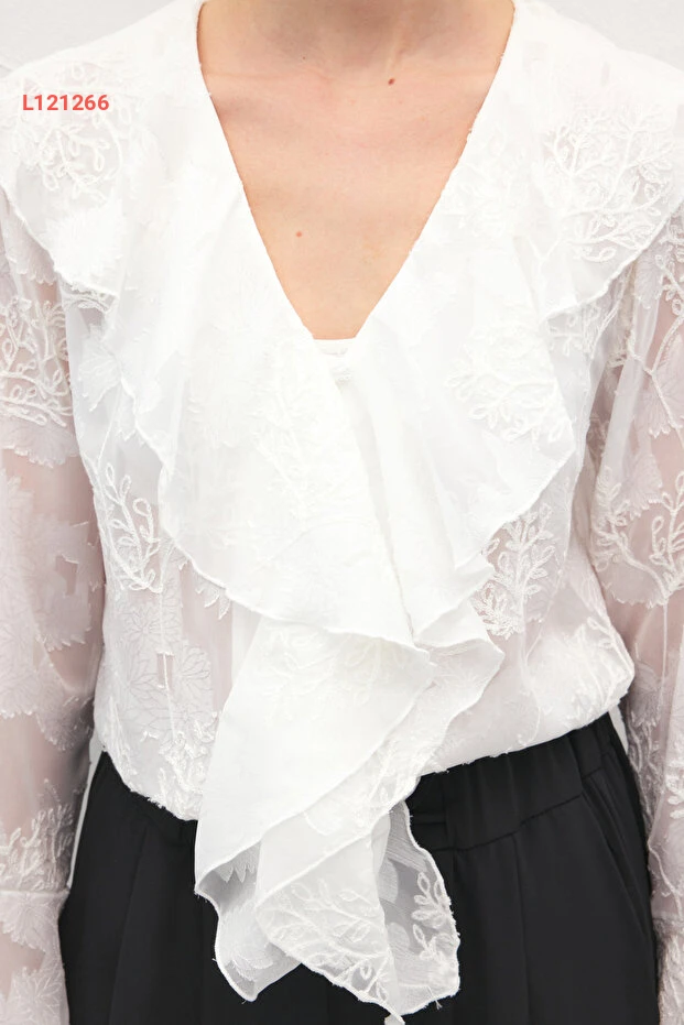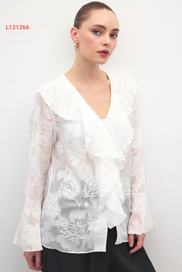 استمتع بجمال الأناقة مع قميص Sateen ذو الفُرْفُرَات المميزة والتفاصيل المطرزة. مصنوع من قماش أكرو المريح، يمنحك لمسة من الفخامة ويتميز بتصميم عصري يناسب جميع المناسبات. ارتديه لإطلالة تناسب العمل أو الخروجات الجميلة مع الأصدقاء.