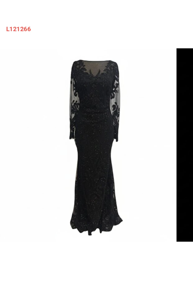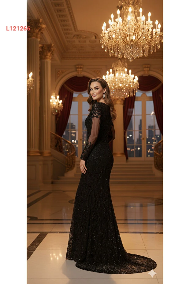 فستان سدارا ميلانو آتيليه الفاخر - طويل الأكمام بتفاصيل كريستالية باللون الأسود
