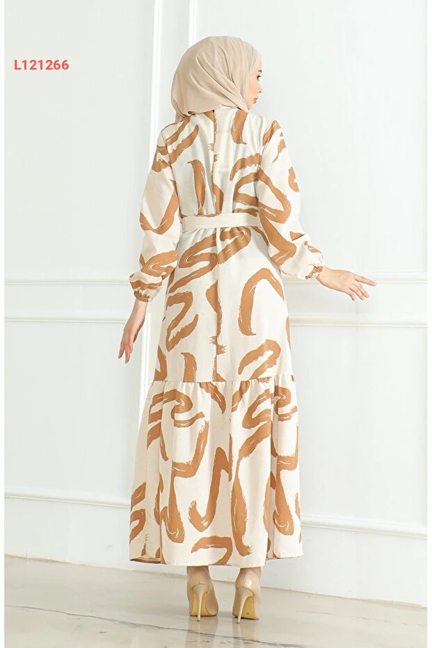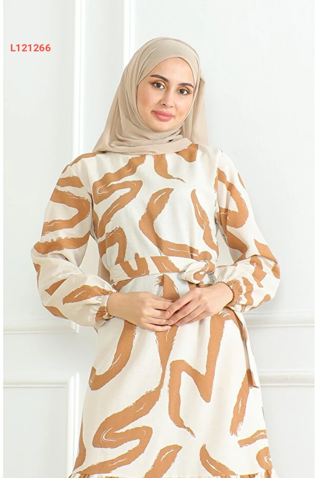 فستان كتان مزخرف بحزام من سيفاميرف - 0471A-08 بيج بني