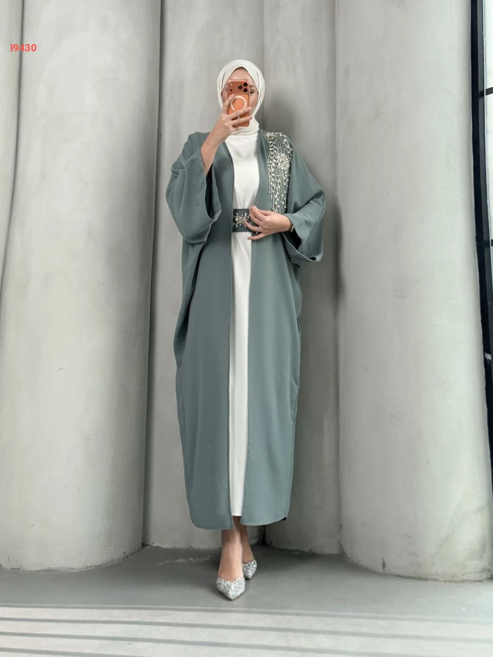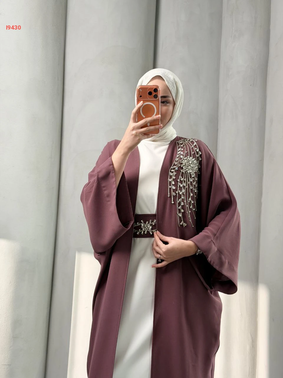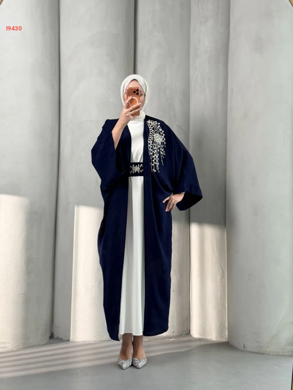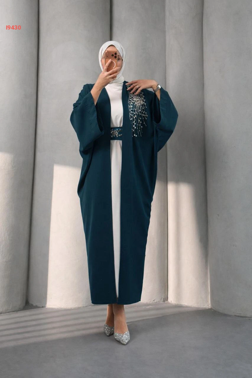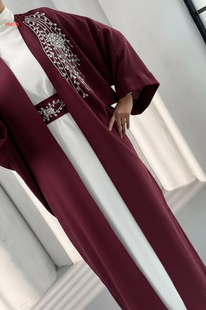 طقم عباية مزينة بيعرق ألماس مع فستان سادة مع حزام