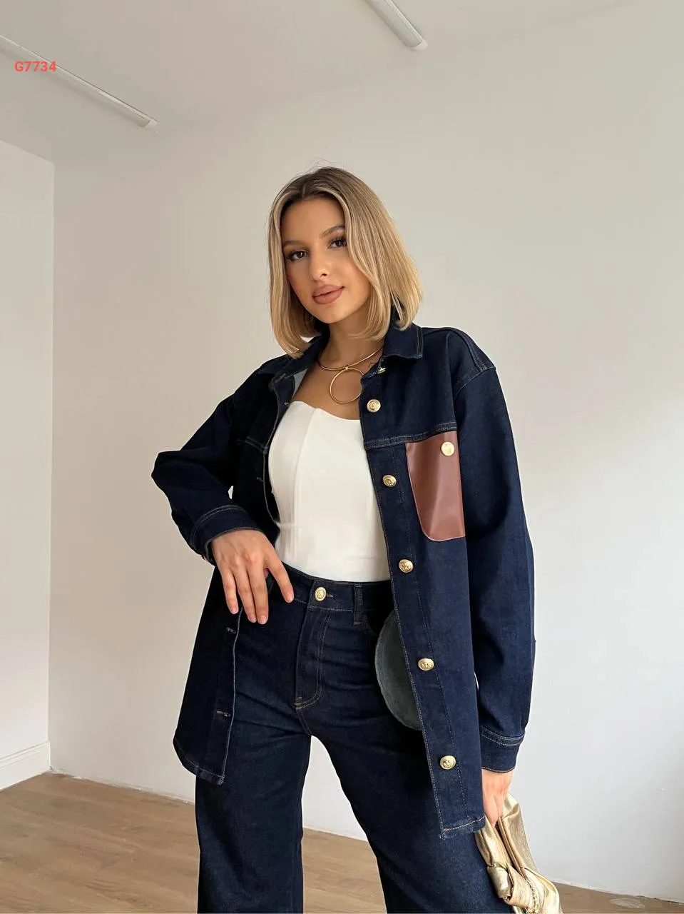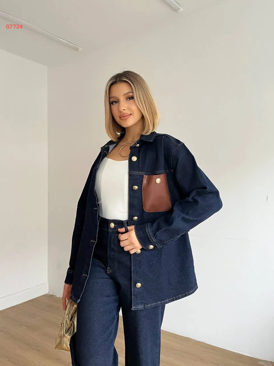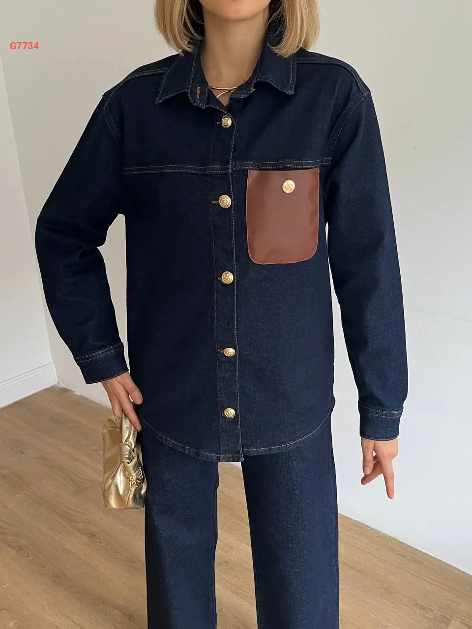 طقم بنطال جينز وجاكيت بجيبة جلد