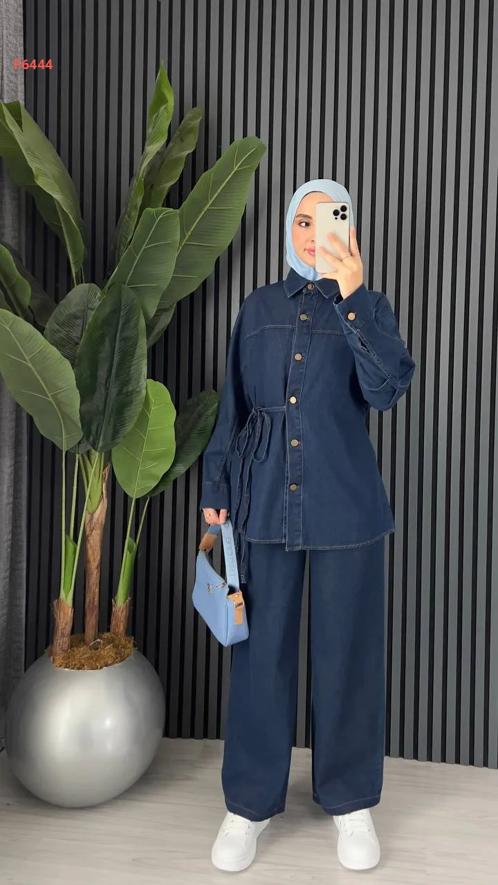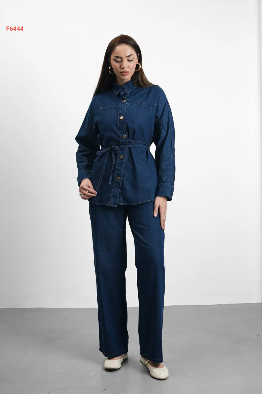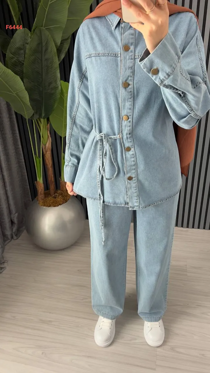 طقم بنطال جينز وجاكيت بربطة جانبية