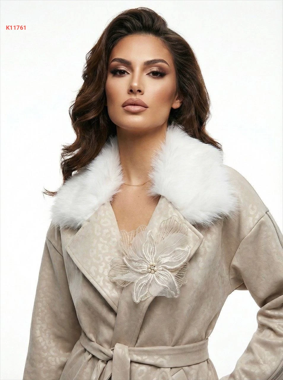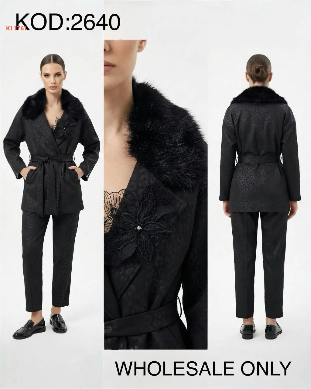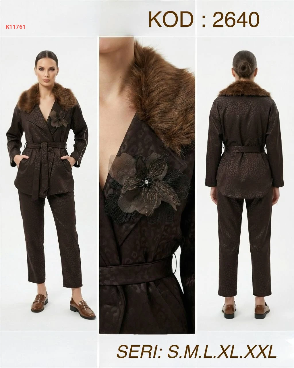 طقم بنطال وجاكيت منقوش بياقة فرو