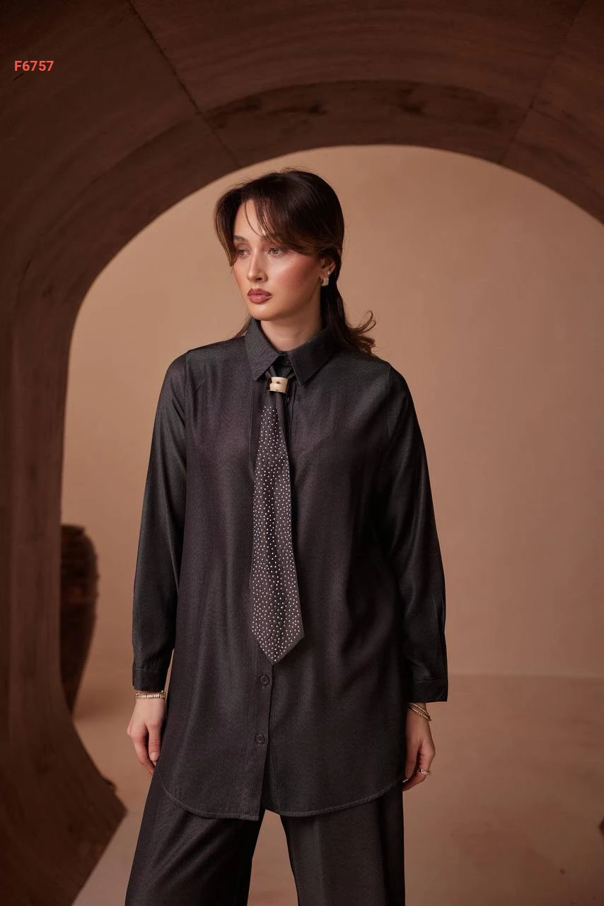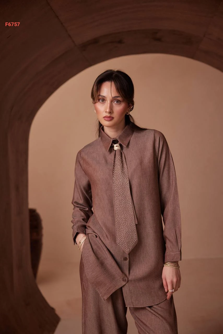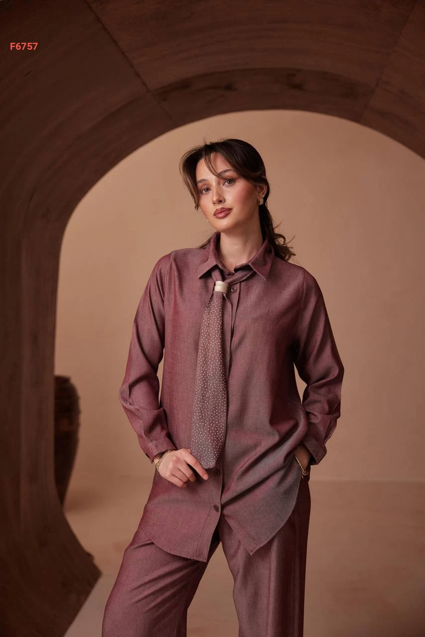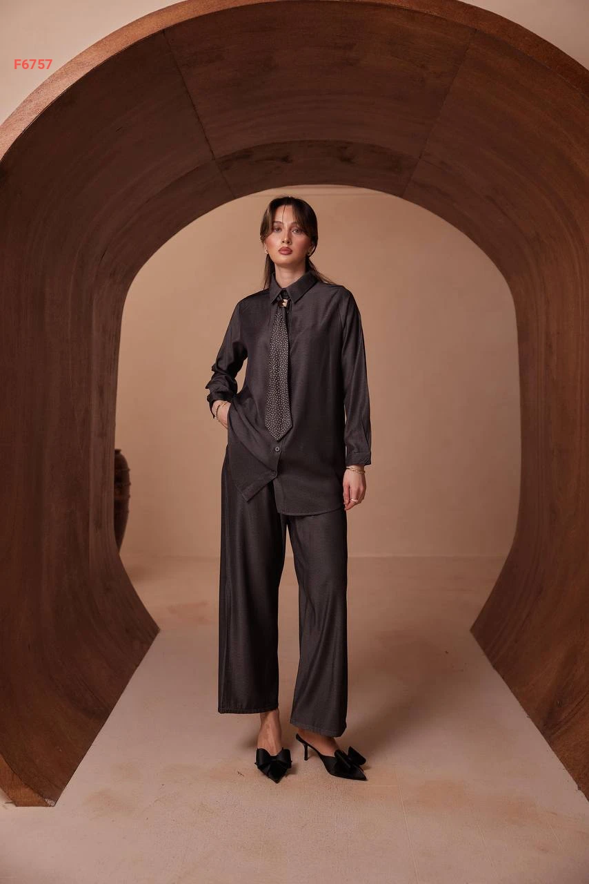 طقم بنطال تنسل وقميص بفولار حجري