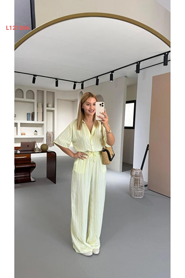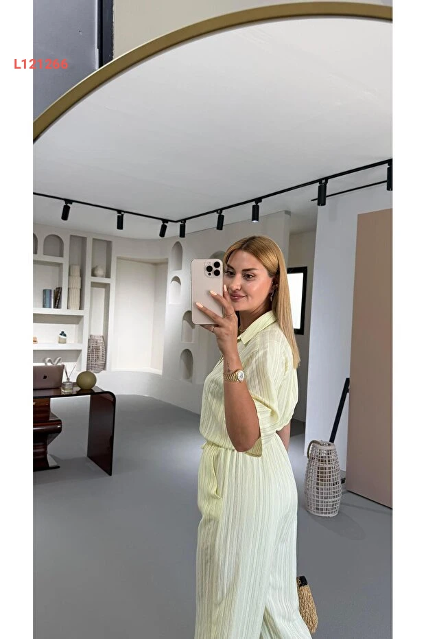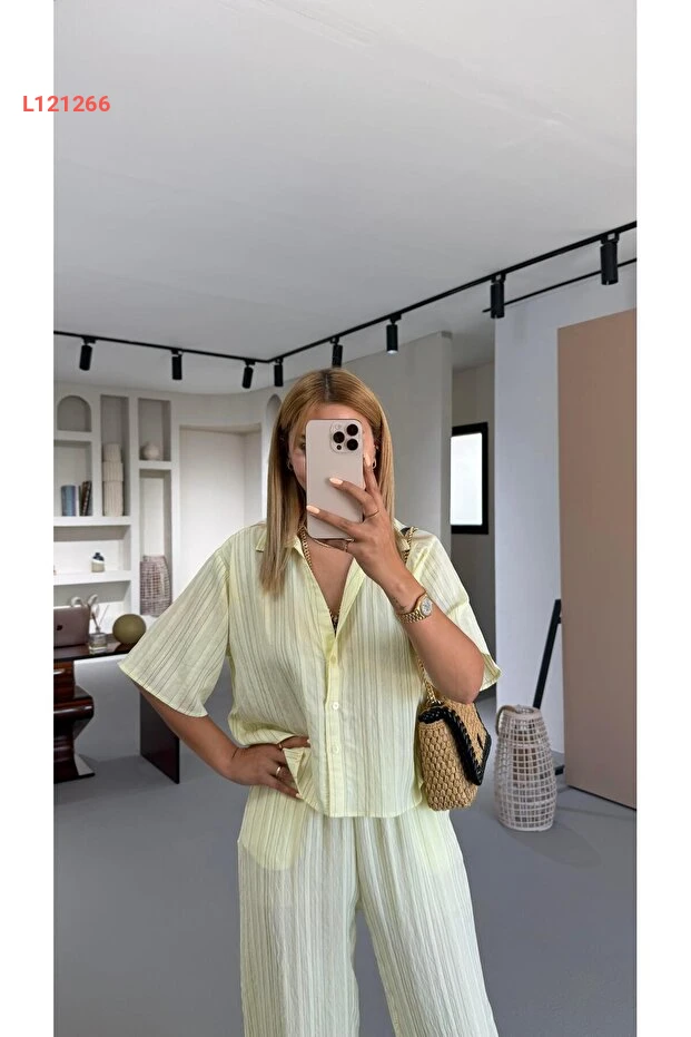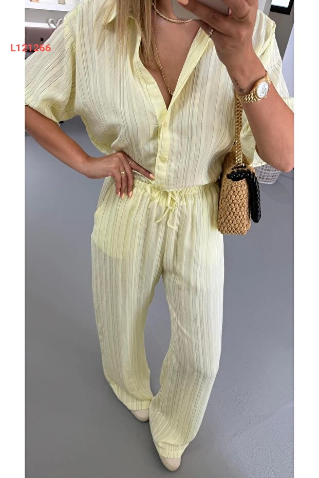 استمتع بالأناقة العصرية مع طقم Sezgi Tekin المكون من بلوزة وشورت بخطوط رائعة باللون الأصفر. يتميز القماش الخفيف والهيكل المريح بلمسة فاخرة، مما يجعله الخيار المثالي لإطلالة مريحة وأنيقة في كل المناسبات. ارتدي هذا الطقم لتبرز أناقتك وتضفي لمسة حيوية على خزانة ملابسك.