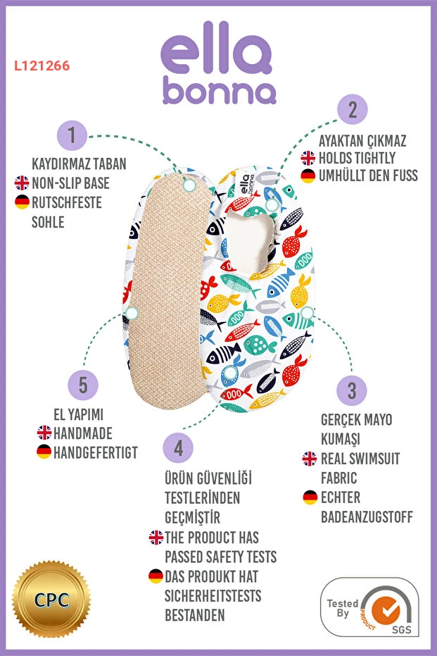 استمتع بأوقات المرح في الماء مع حذاء Ella Bonna ذو القاعدة المضادة للانزلاق، المثالي للأطفال والصغار. يتميز بتصميم رائع مزين بأسماك ملونة، مما يجعله الخيار المثالي للسباحة واللعب في المسبح أو على الشاطئ، مع توفير راحة فائقة وأمان تام لخطوات طفلك.