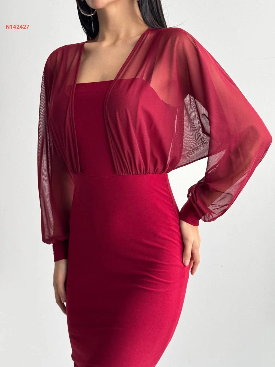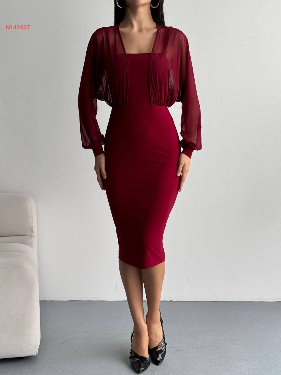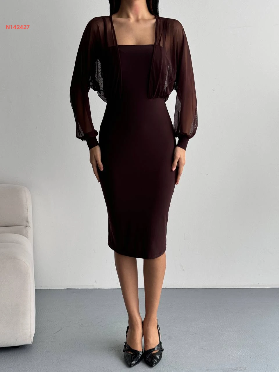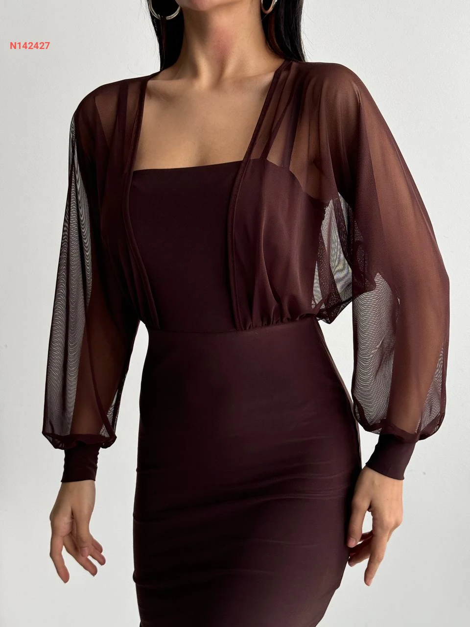 فستان ميدي بأكمام بالونية شفاف