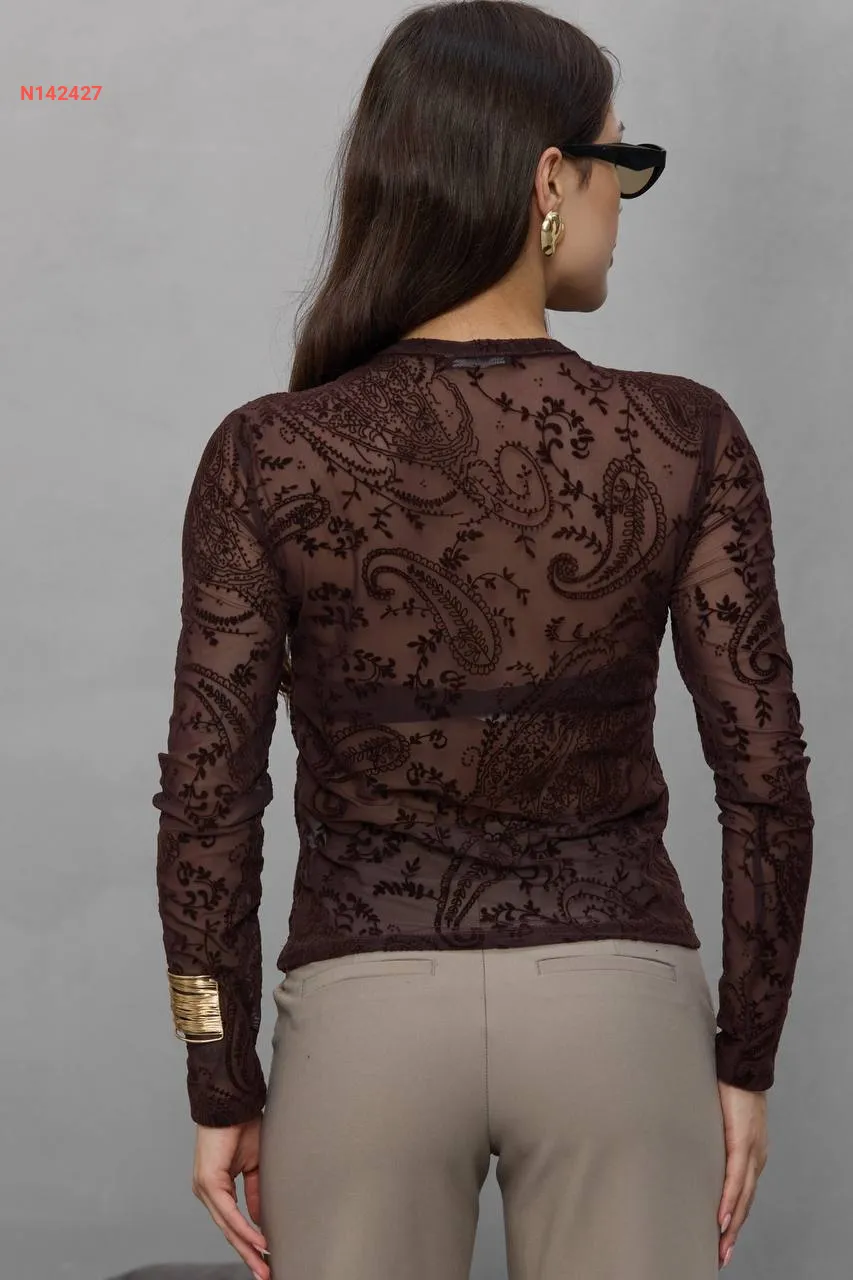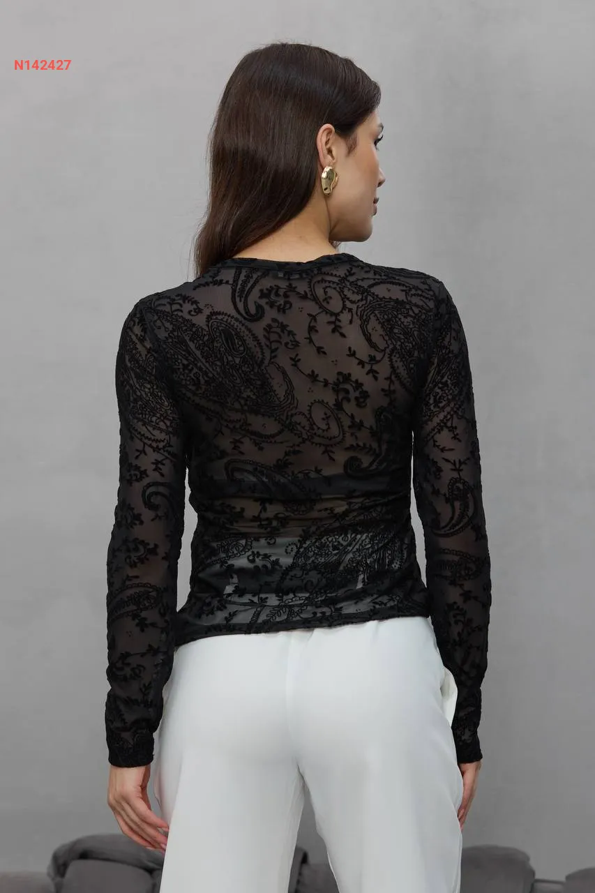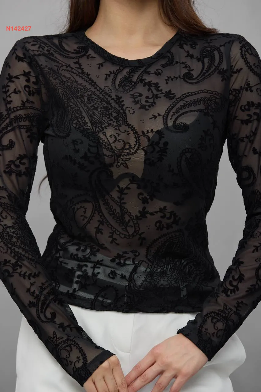 بلوزة كم طويل شفاف منقوشة