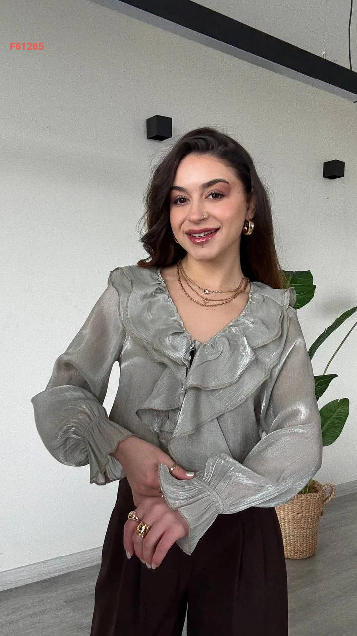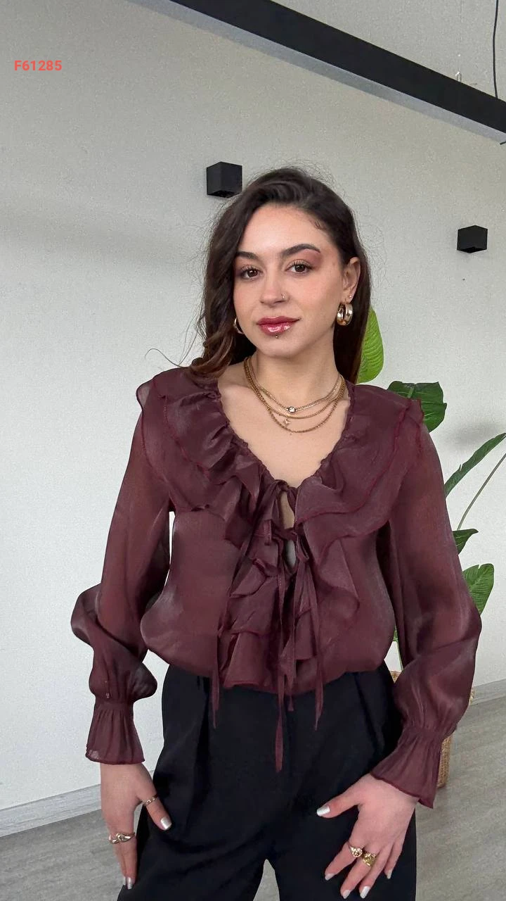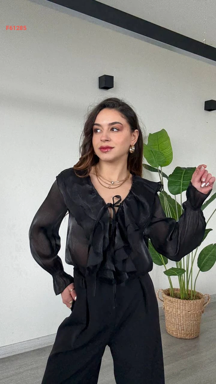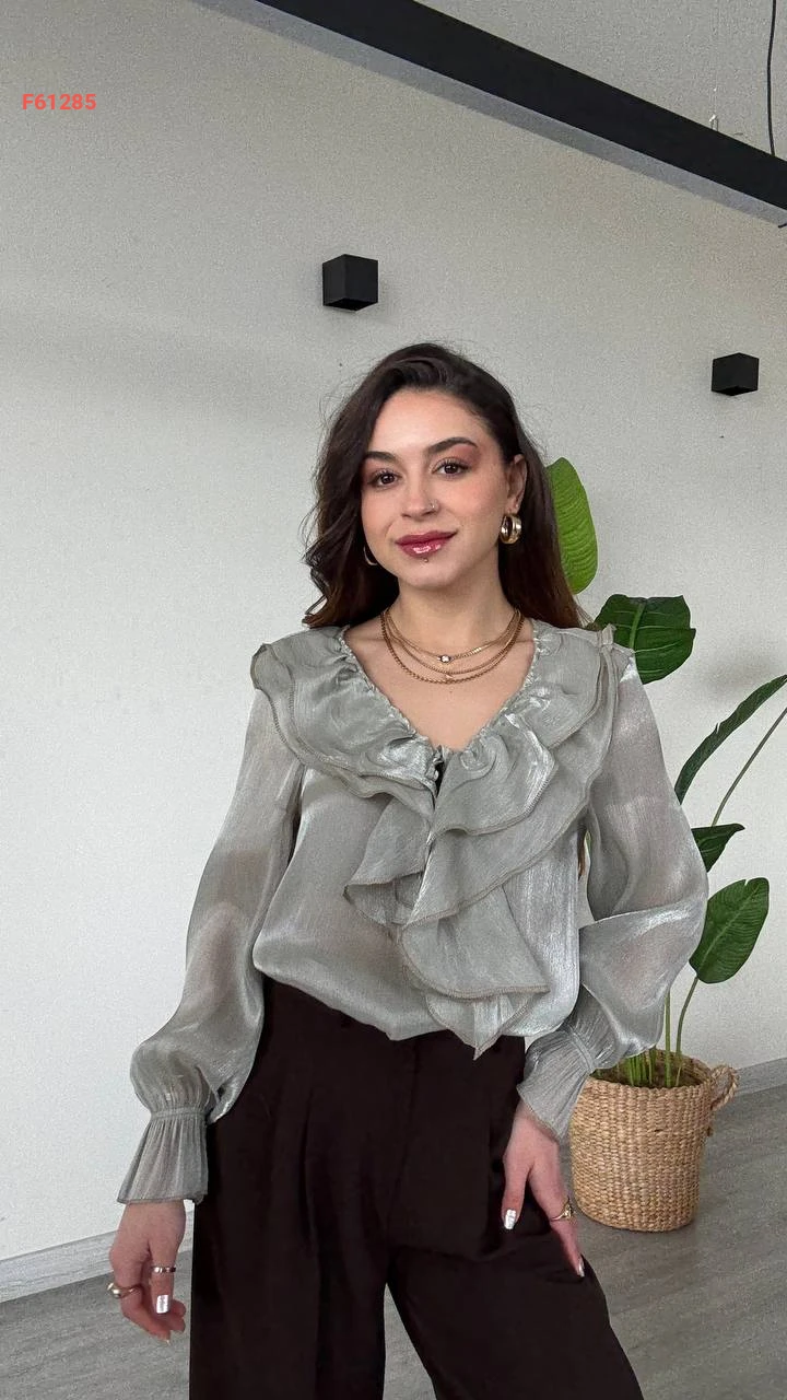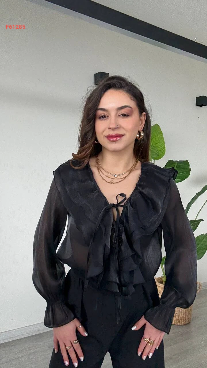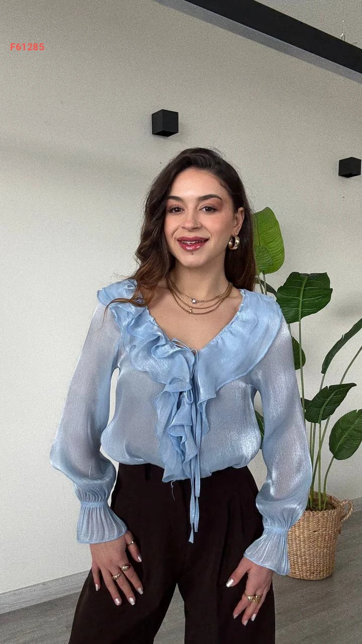 بلوزة شفاف لميع بتفاصيل مكشكشة