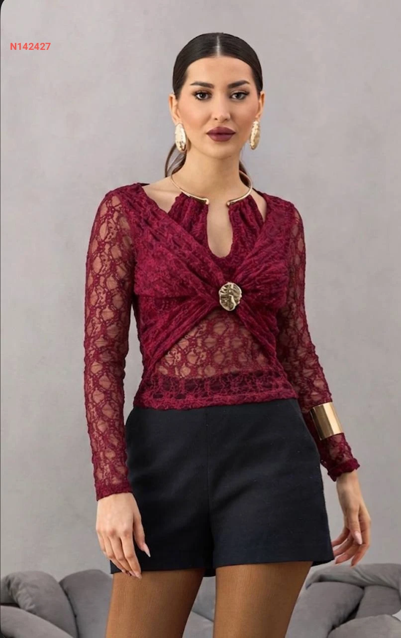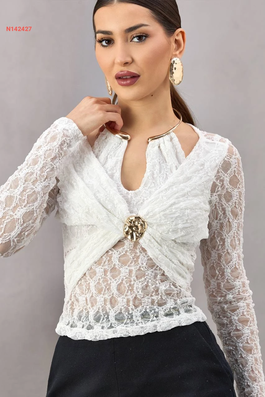 بلوزة تول شفافة ببروش واكسسوار عالرقبة