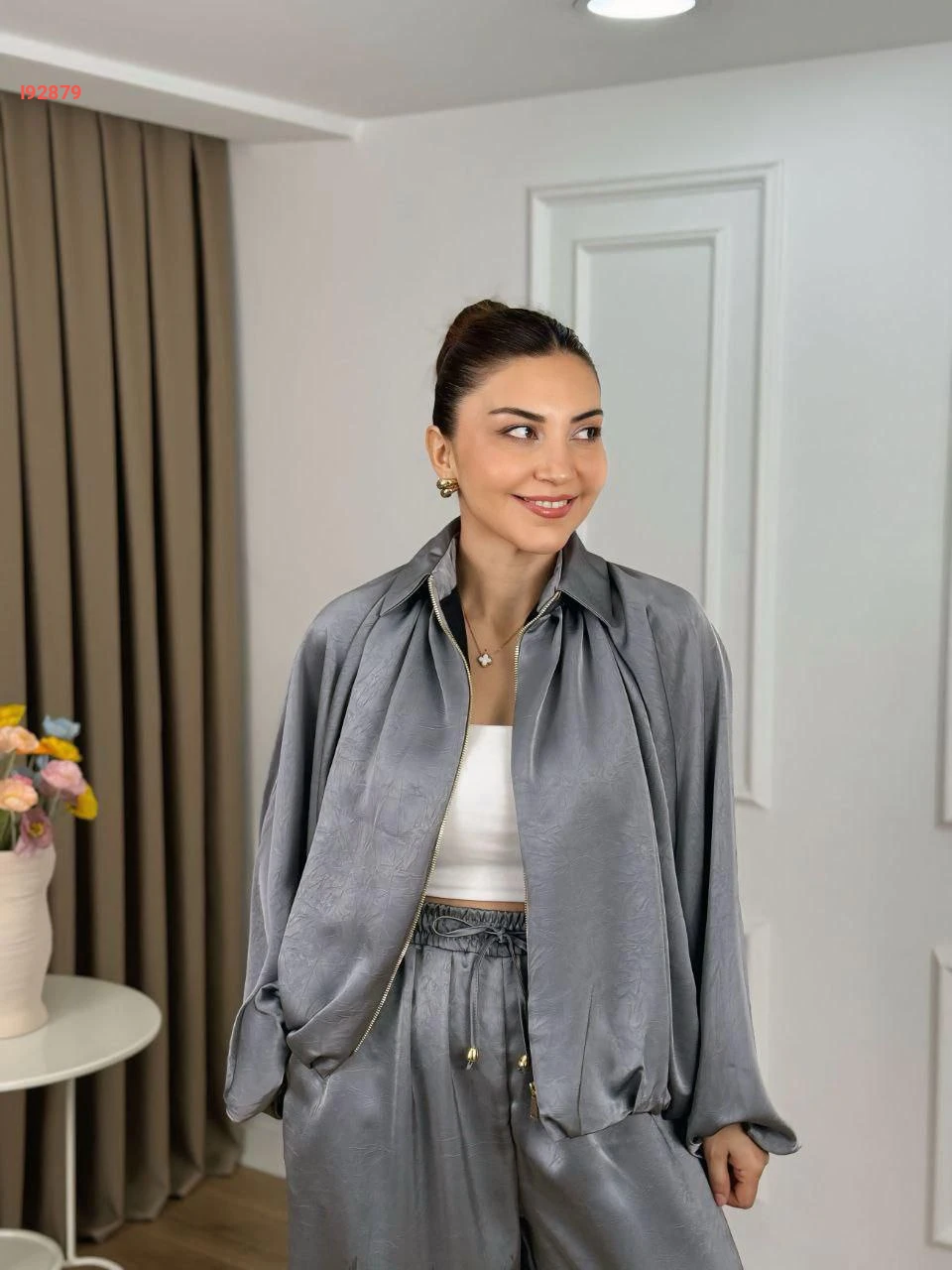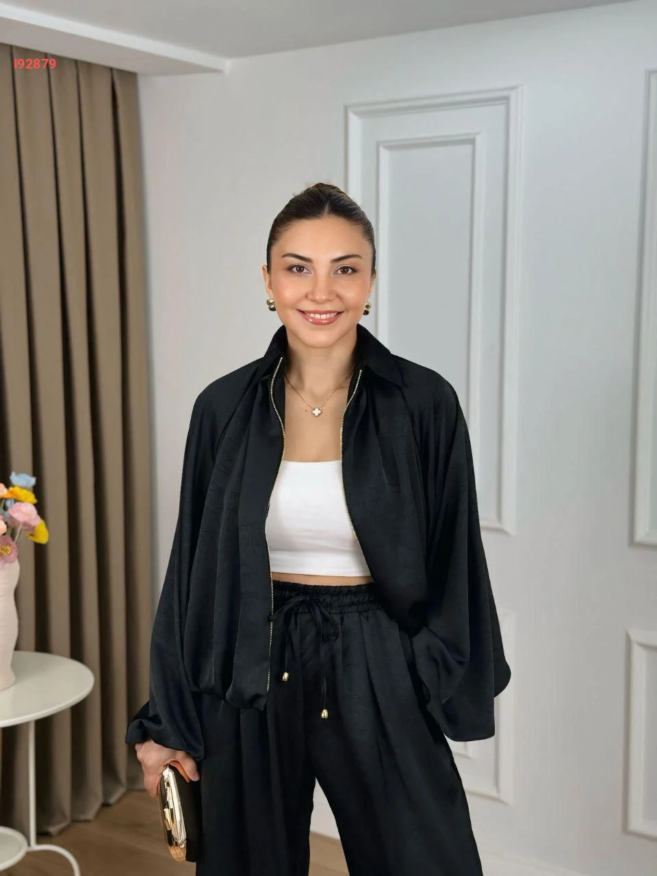طقم بنطال بالون لميع وجاكيت بسحاب