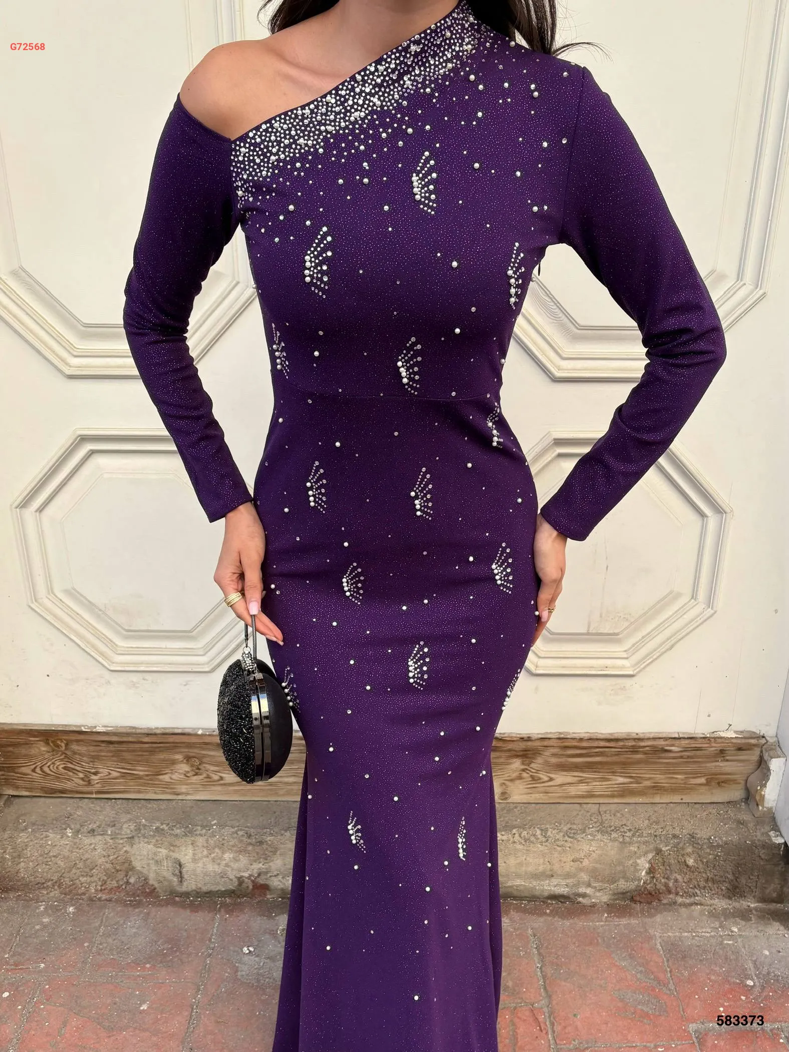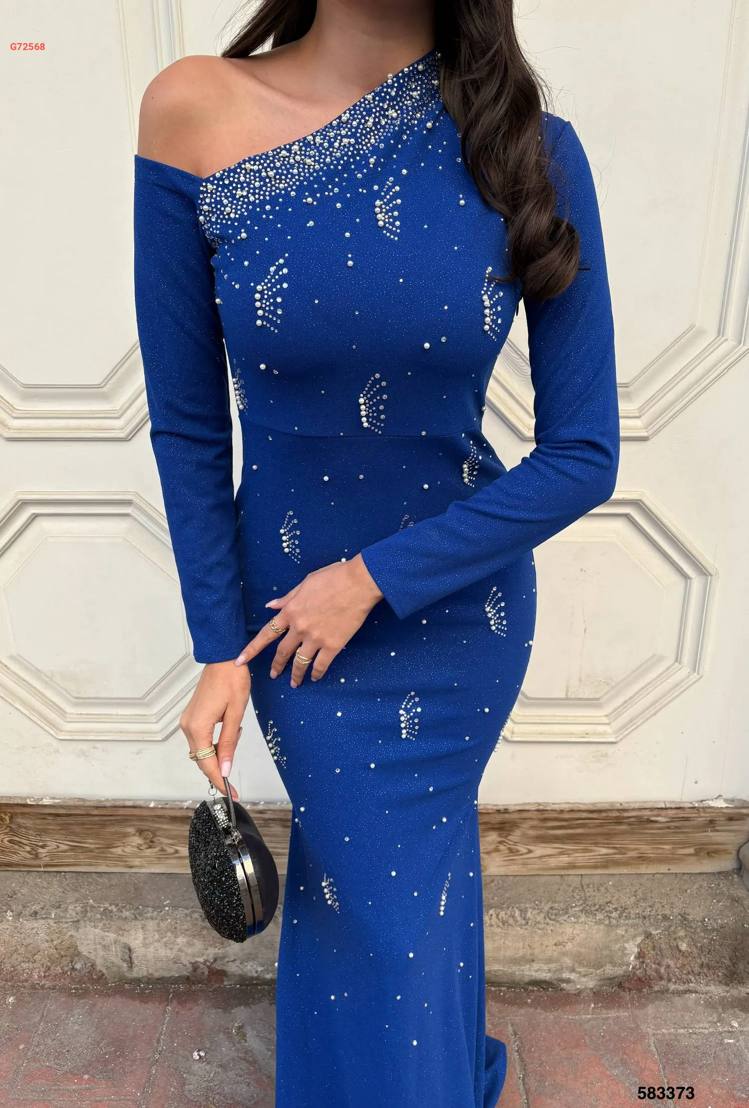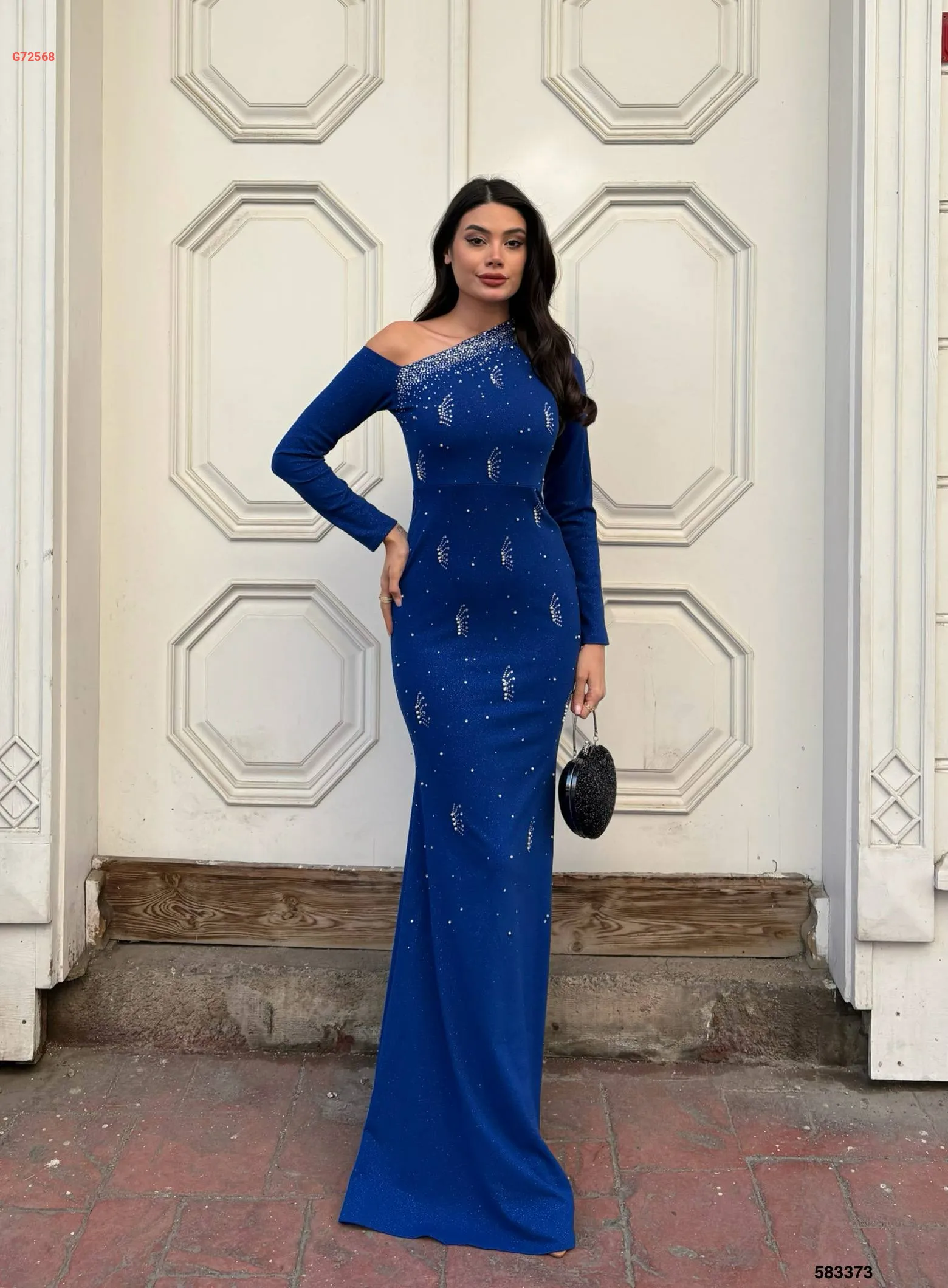 فستان كريب لميع مطرز بأحجار وستراس