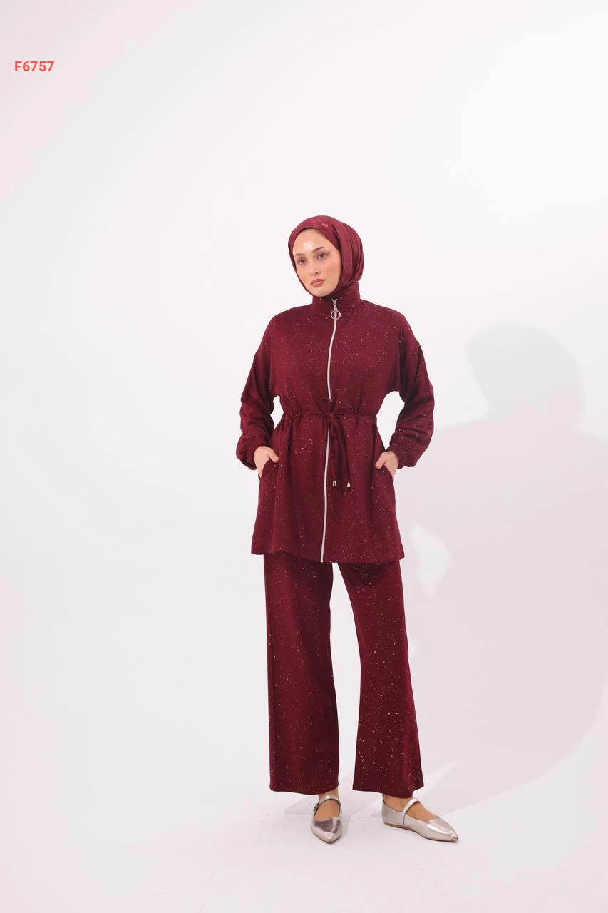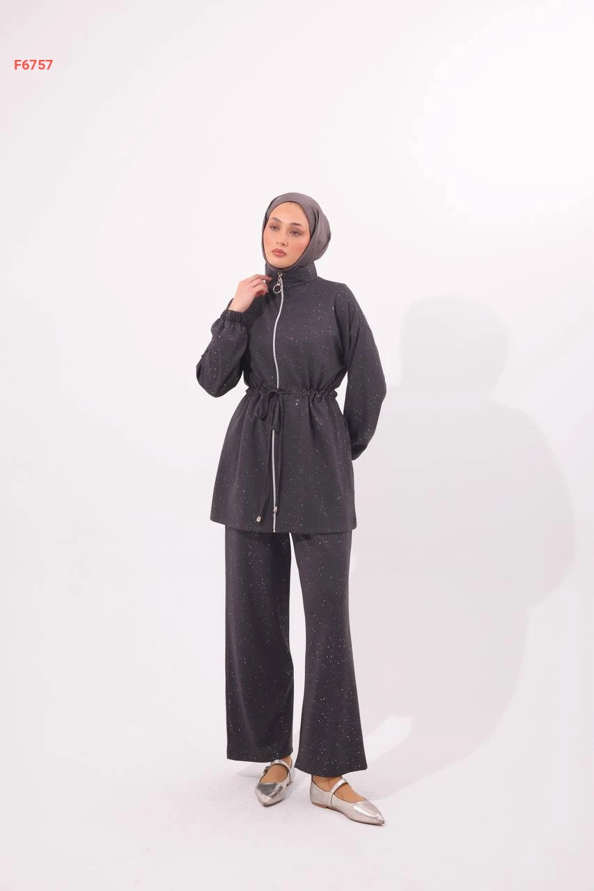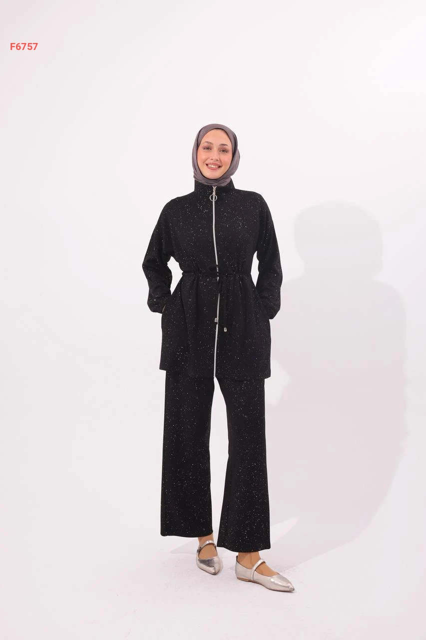 طقم بنطال لميع مع جاكيت بسحاب