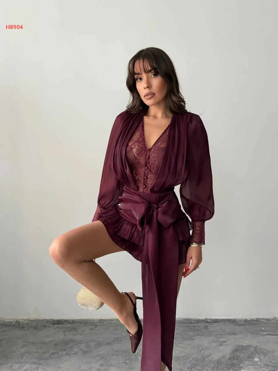 فستان قصير كشكش لميع مع دانتيل