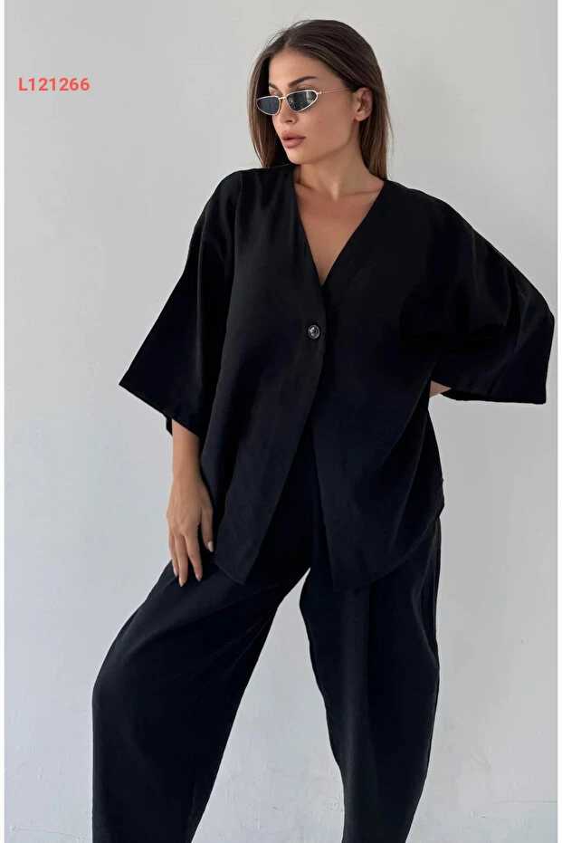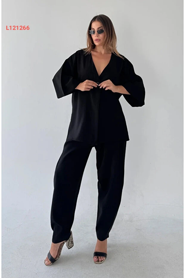 استمتع بأناقة الزي اليومي والمكتبي مع طقم الكيمونو الأسود من شيرون. يتميز بتصميمه العصري المكون من قطعتين مع إغلاق بزر واحد، مما يضمن لكِ الراحة والحرية في الحركة. اجعلي كل إطلالة لكِ تعكس ذوقك الرفيع وروحك النشطة!