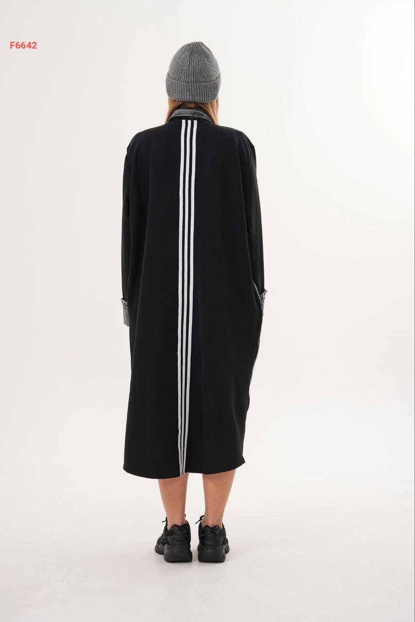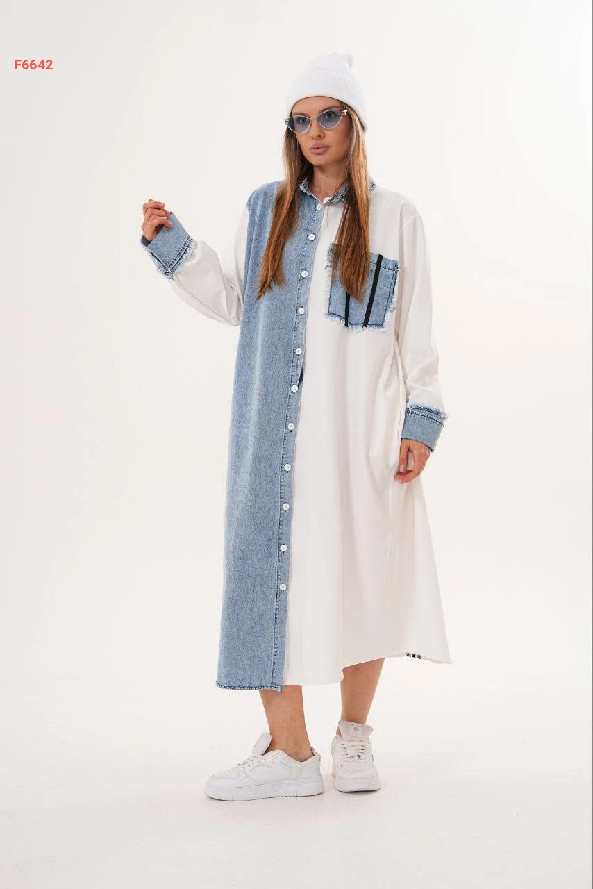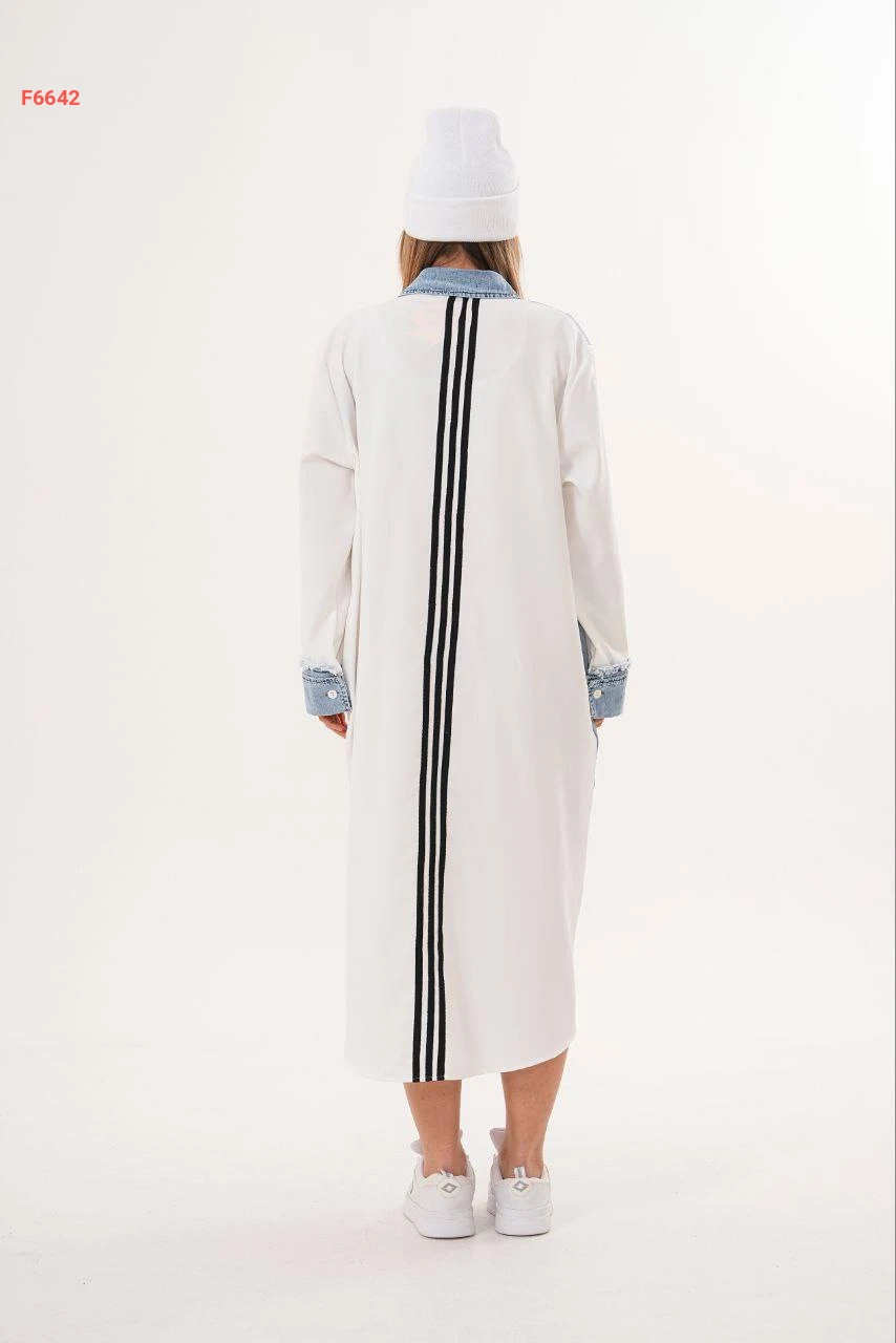 فستان قميص بأزرار بنصف جينز مع جيبة عريضة مخطط من الظهر