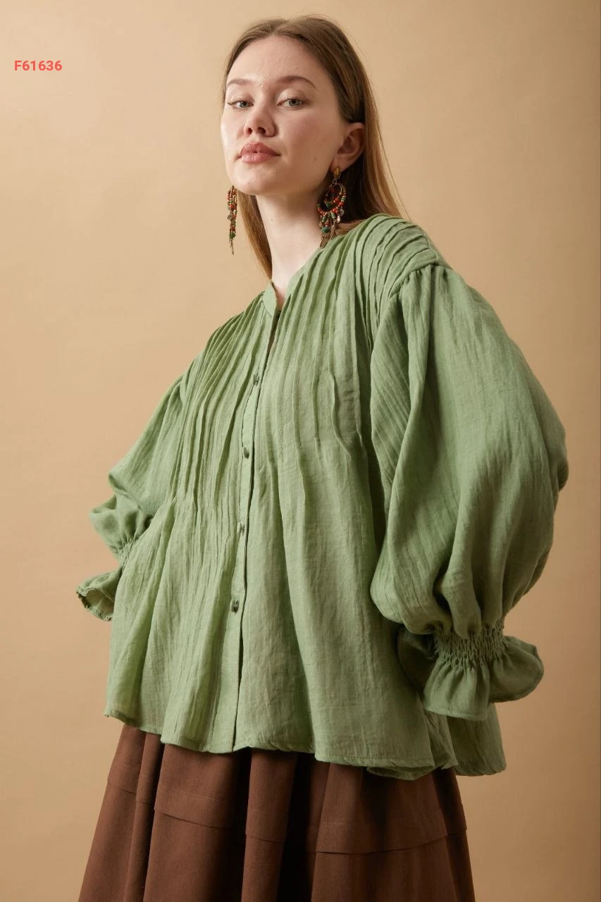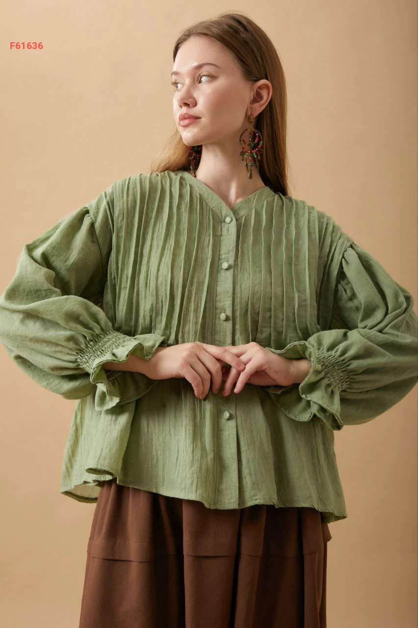 قميص بأزرار مع كسرات وزمة عند الأكمام