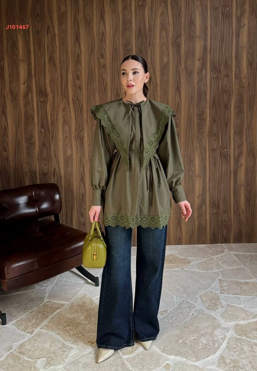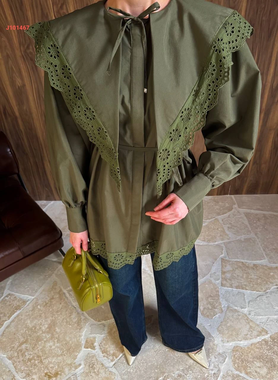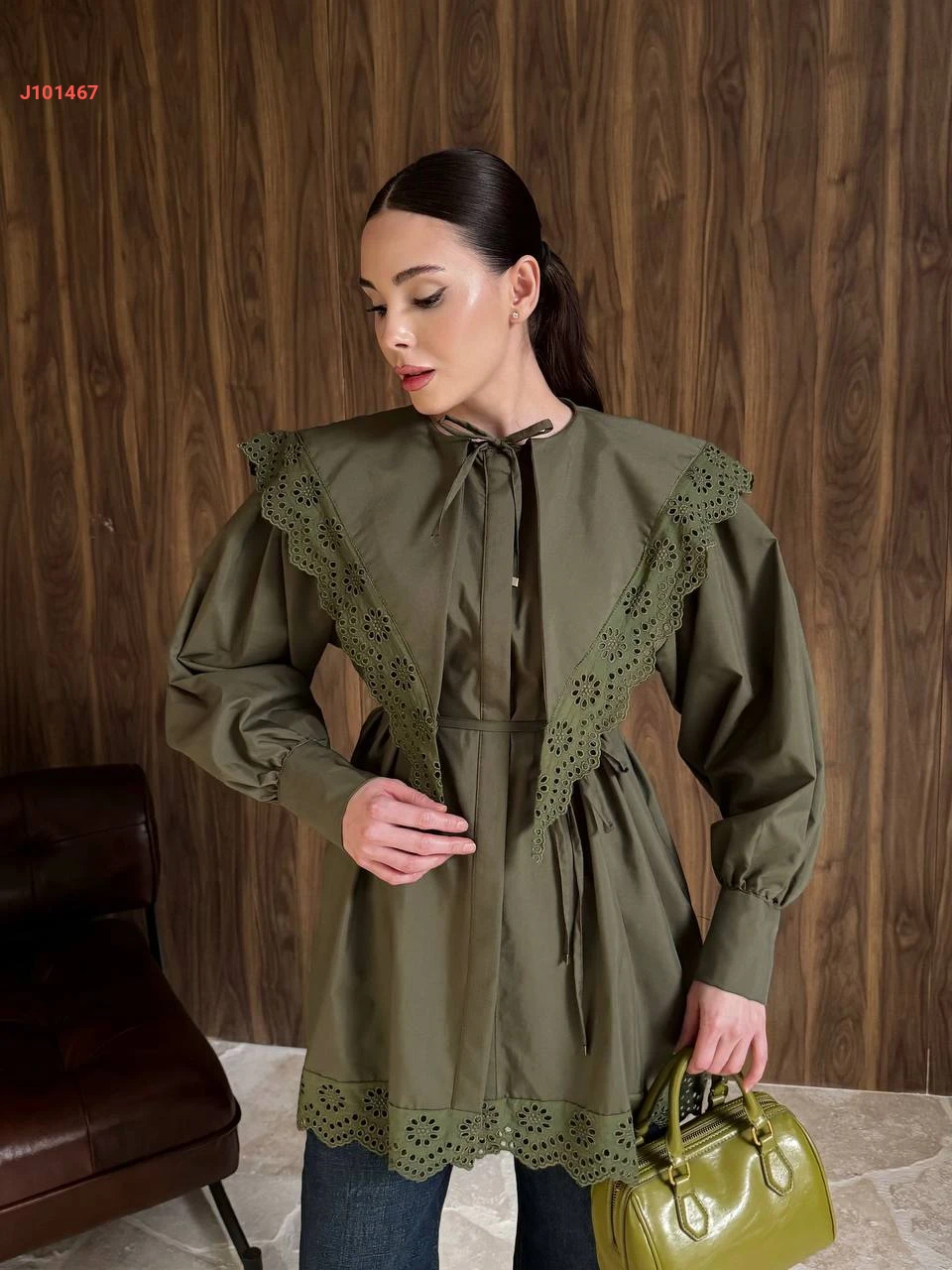 قميص بأزرار مخفية مع ربطة خصر وعنق بياقة عريضة مطرزة مع أكمام مزمومة