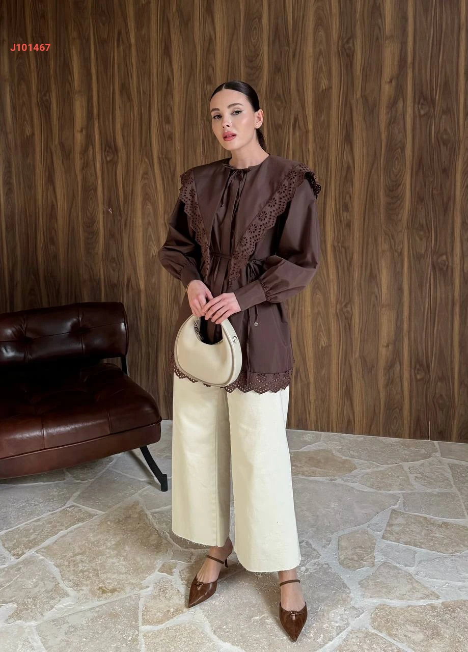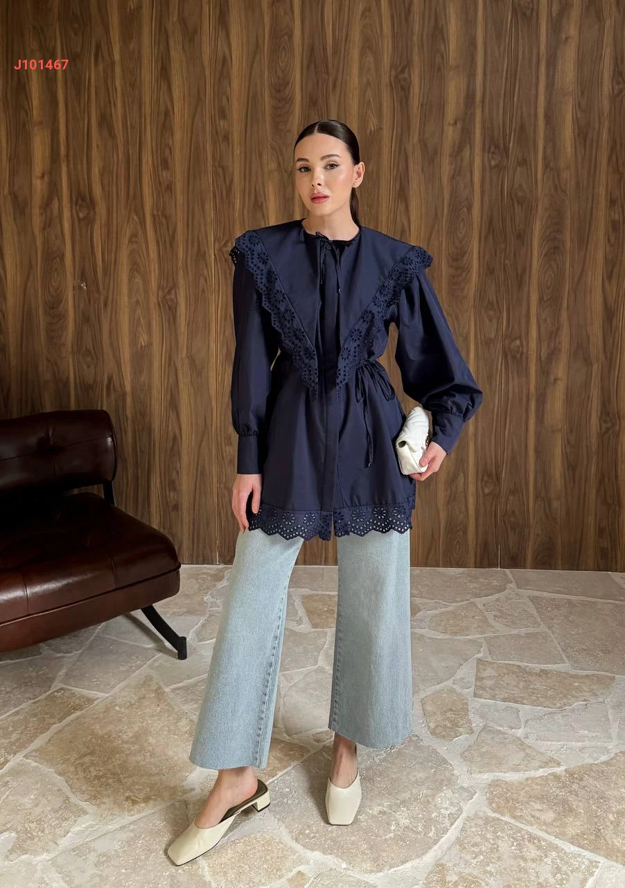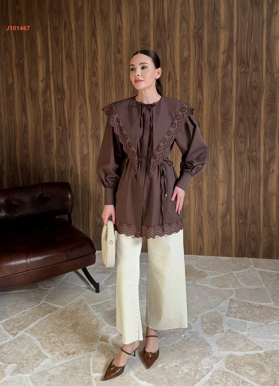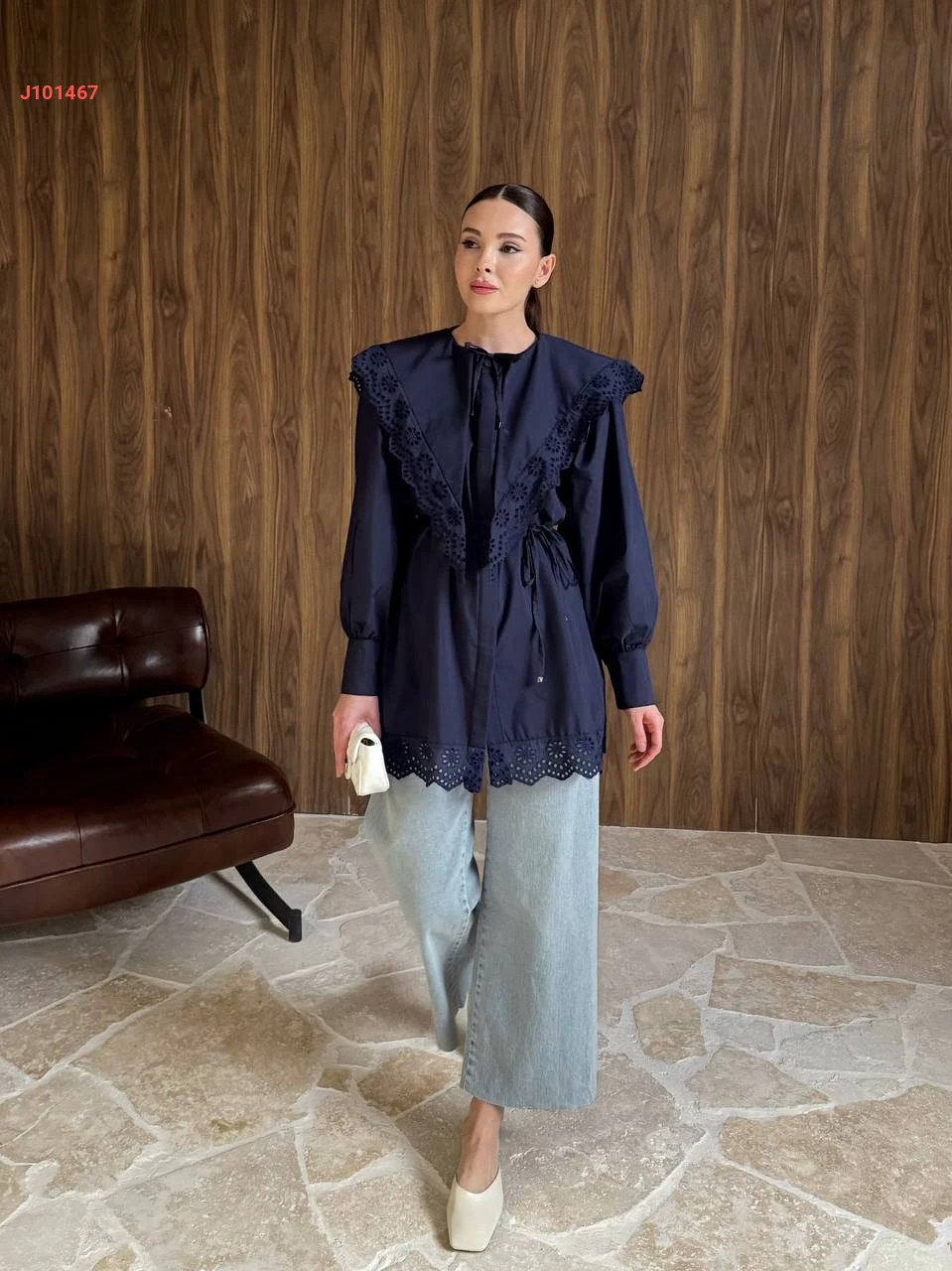 قميص بأزرار مخفية مع ربطة خصر وعنق بياقة عريضة مطرزة مع أكمام مزمومة