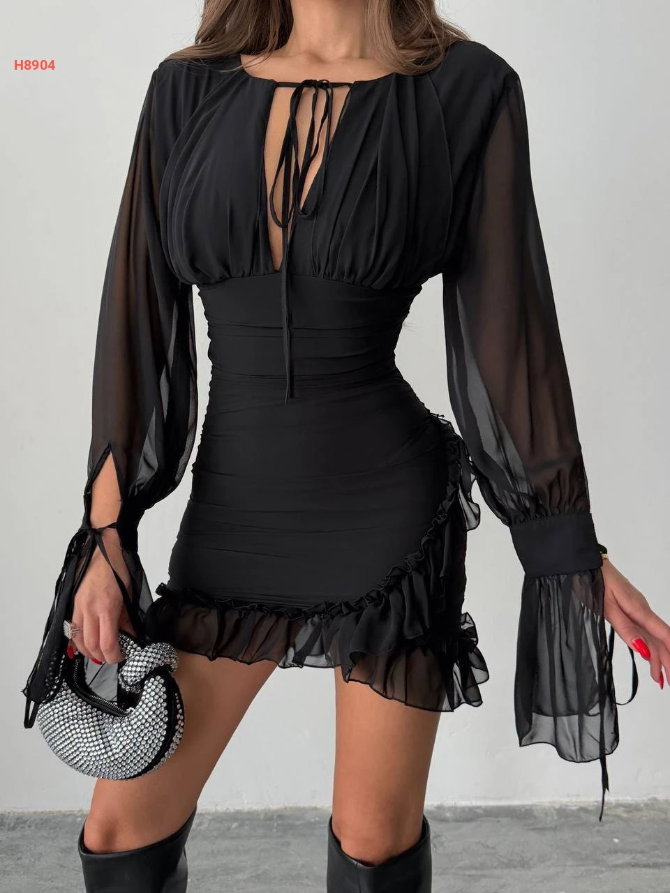 فستان قصير شيفون بربطات
