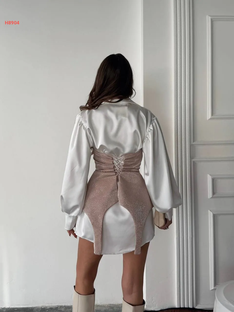 فستان قصير بمشد لميع وربطات خلفية
