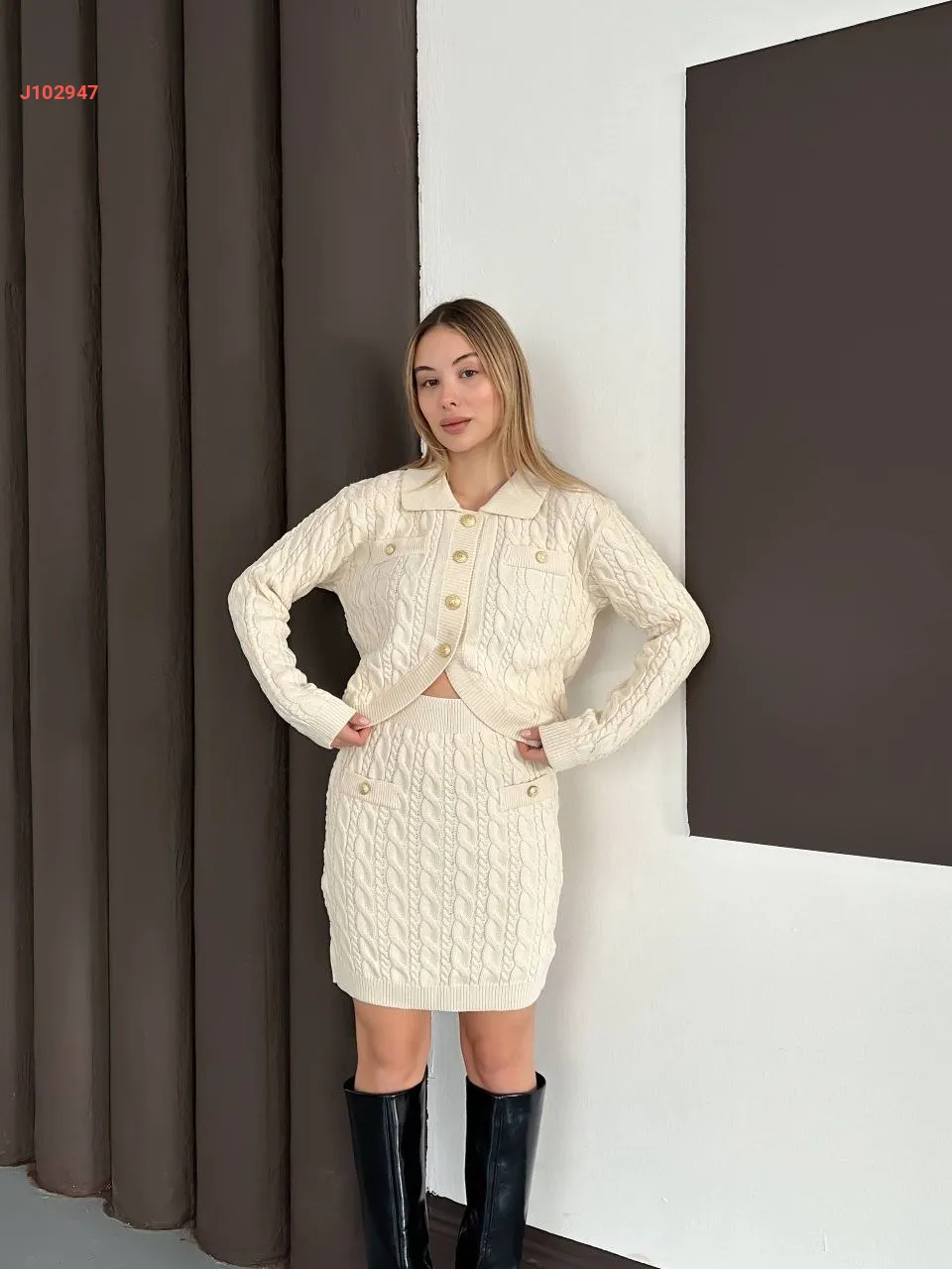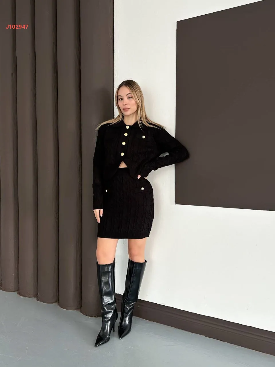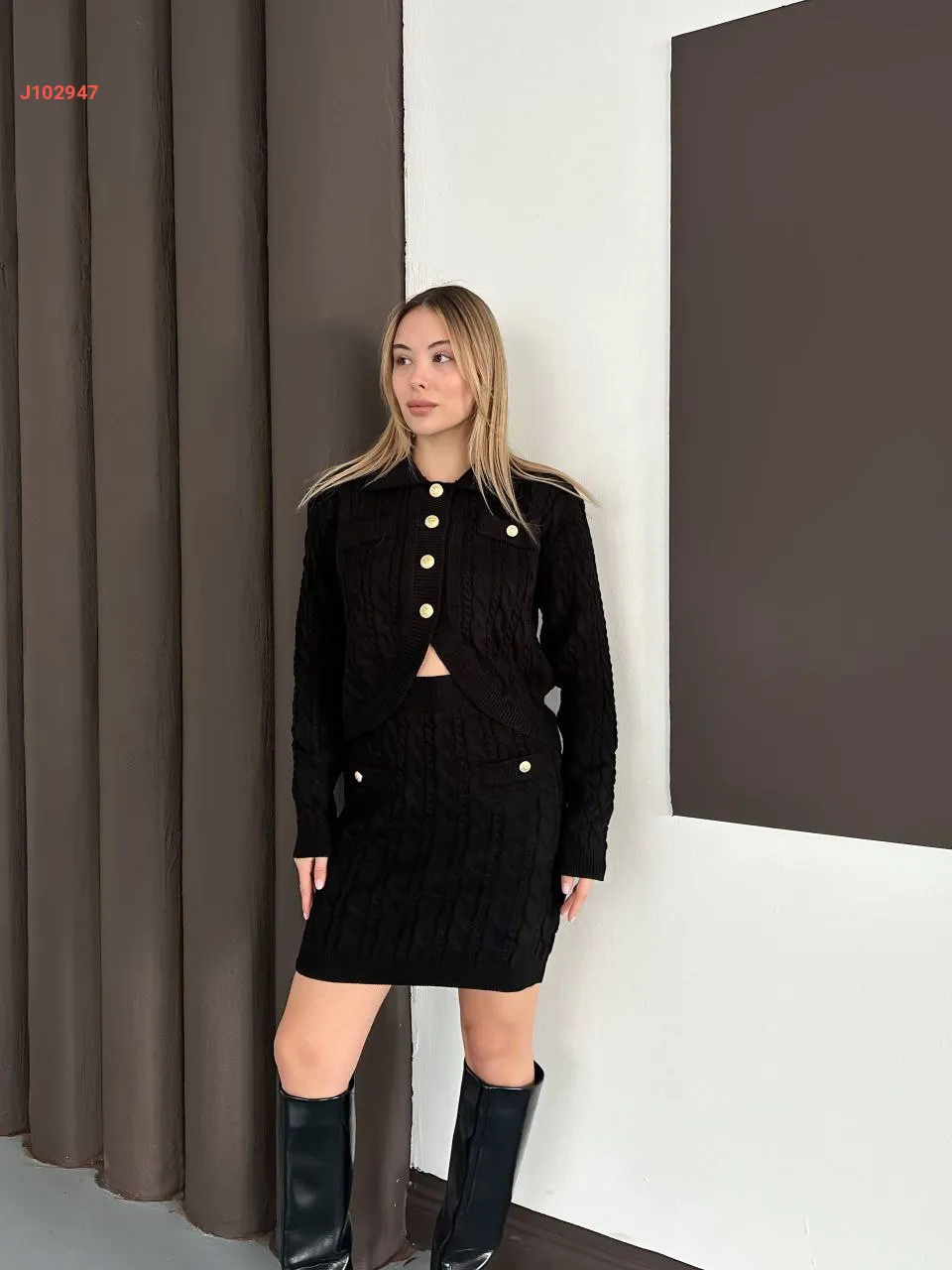 طقم تنورة قصير تريكو بأزرار دهبي