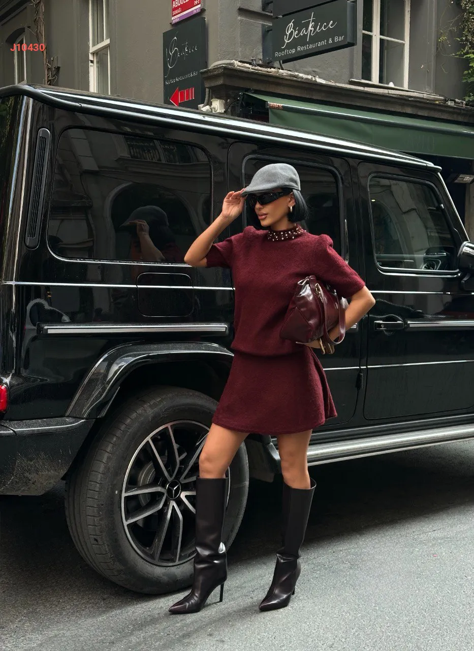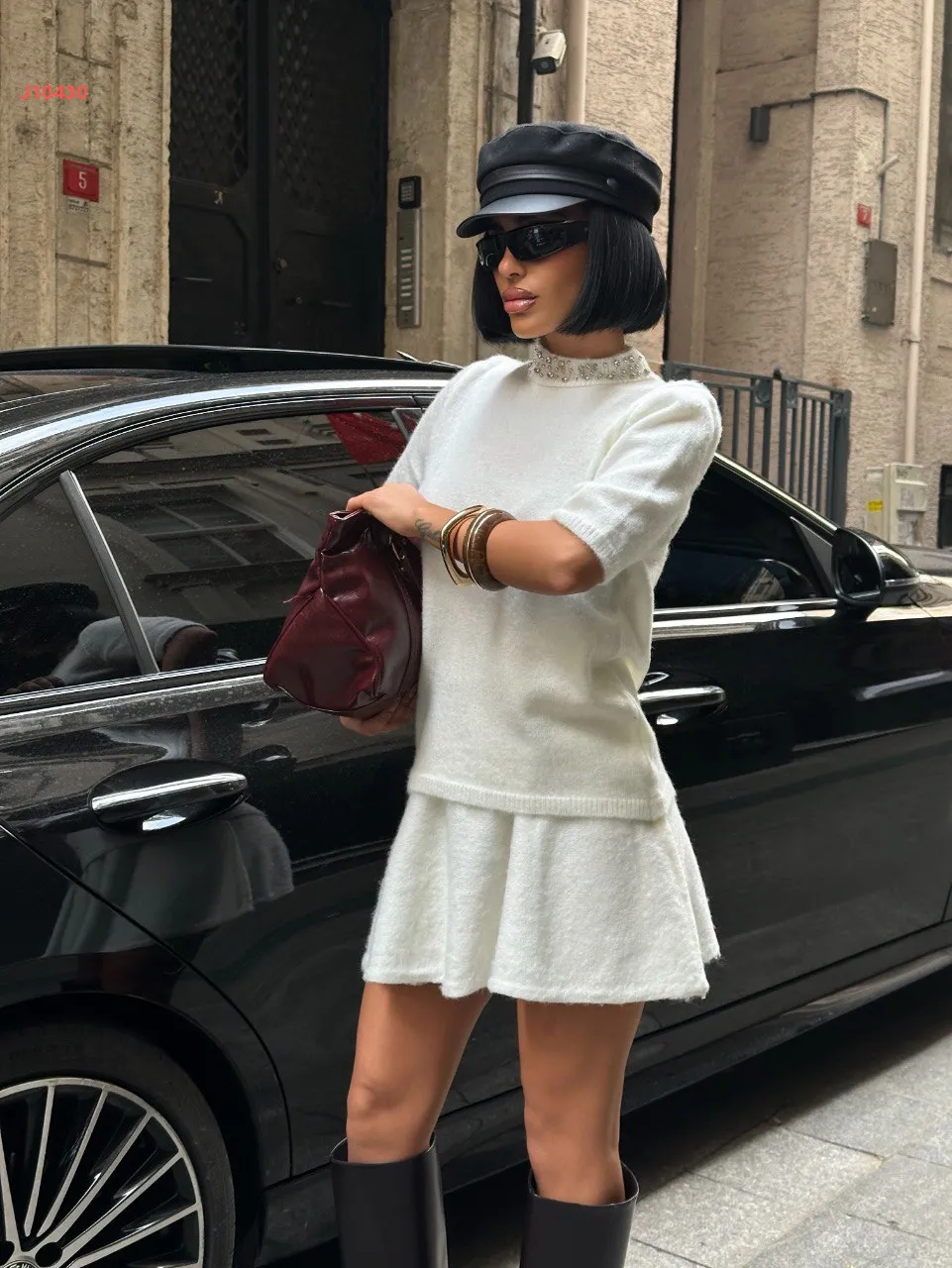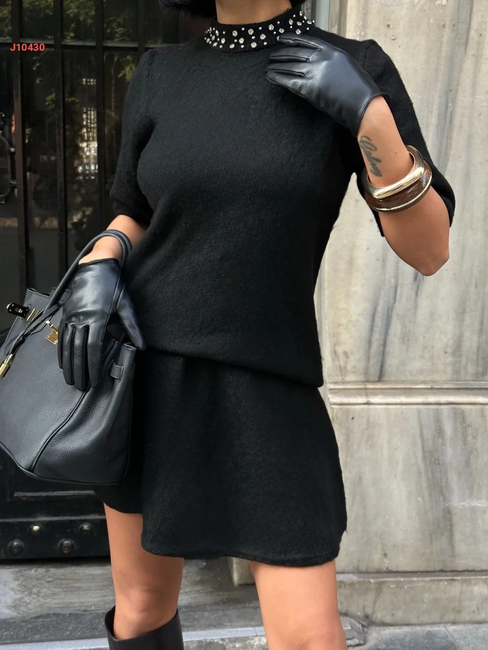 طقم تنورة تريكو قصير بأحجار عالياقة
