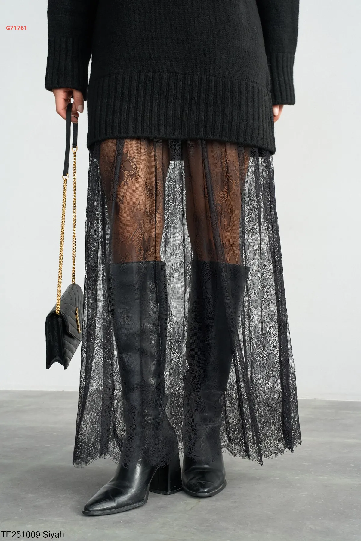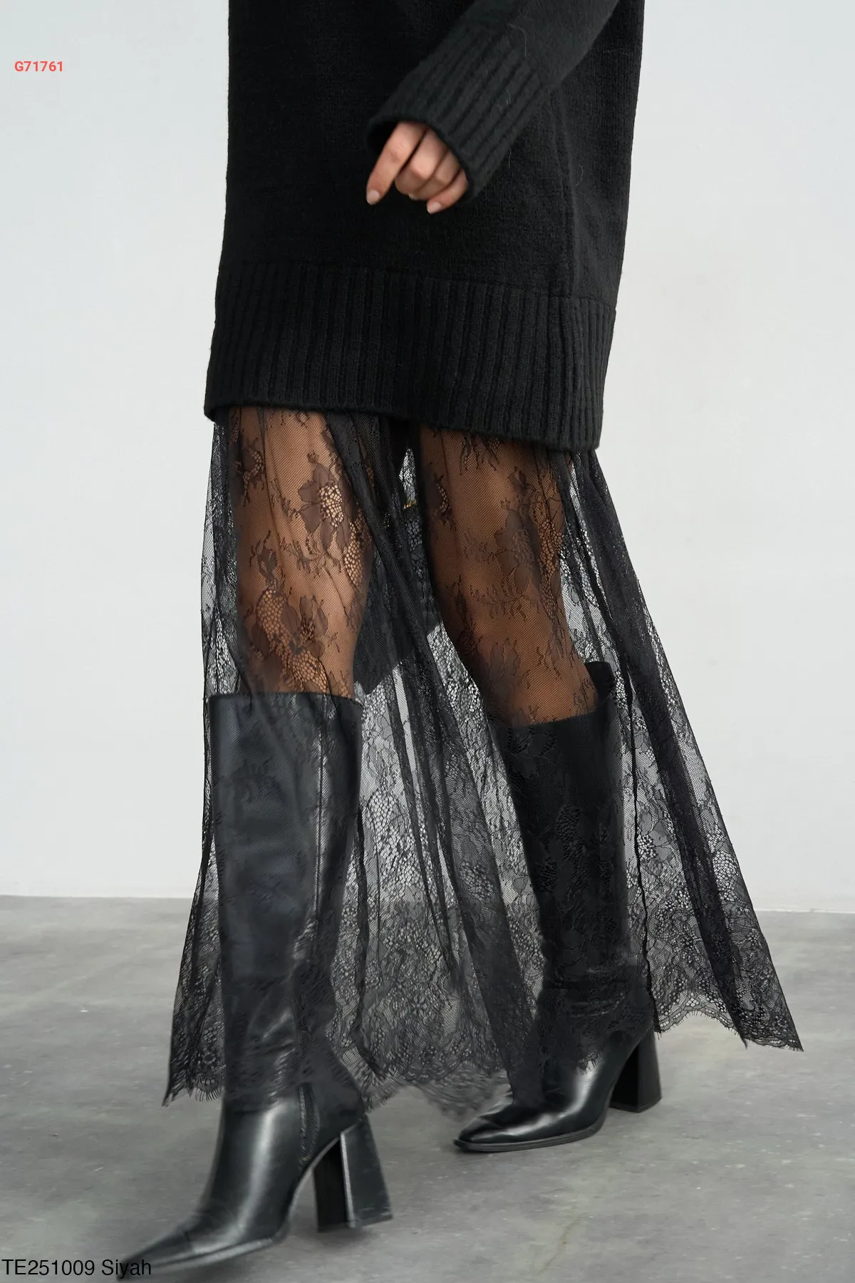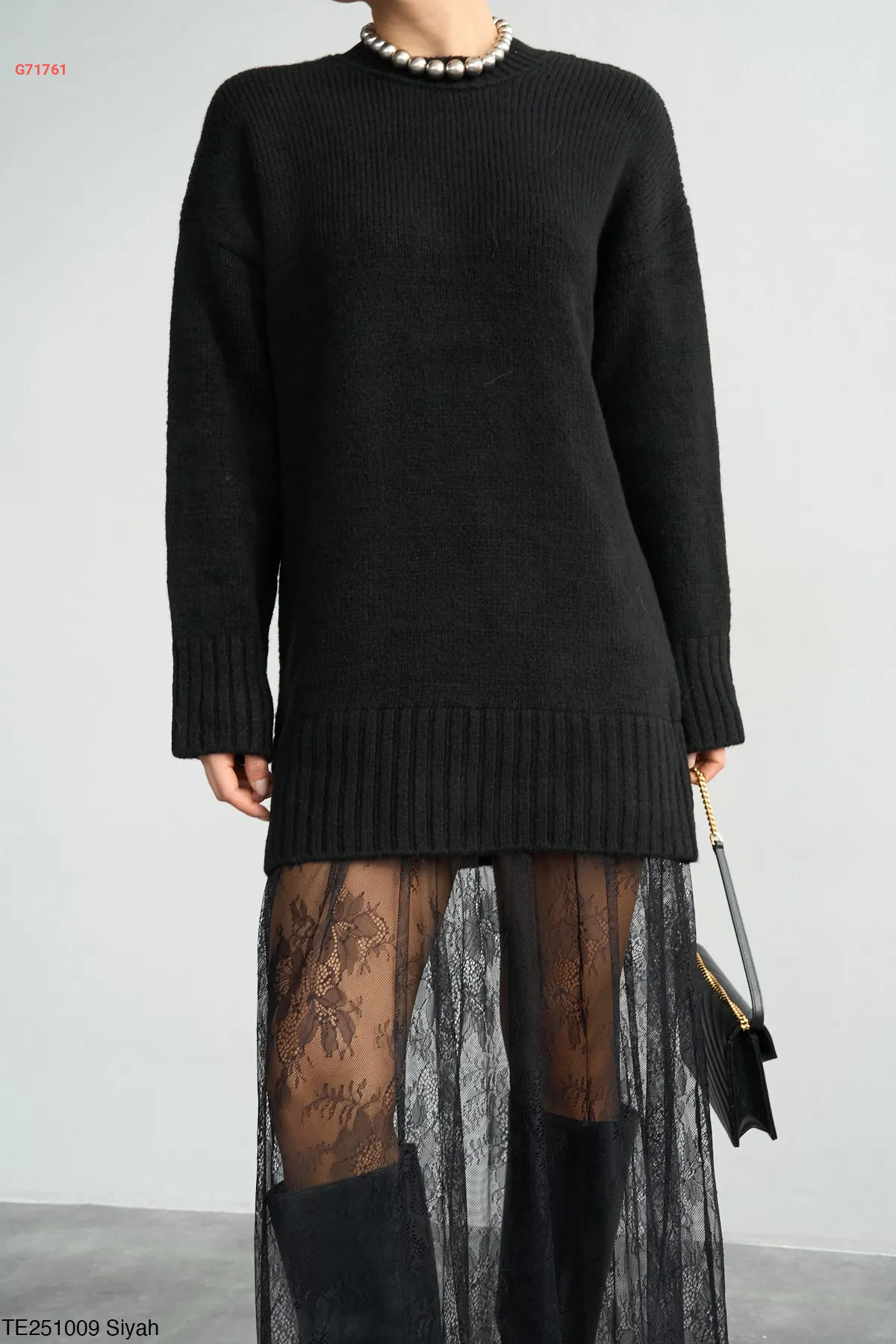 فستان تريكو قصير مع دانتيل كلوش