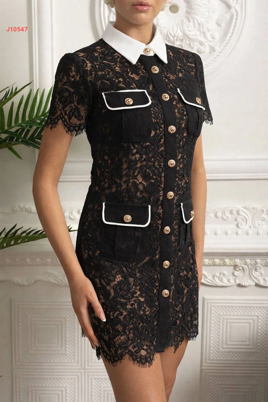 فستان قصير دانتيل مفرغ بأزرار