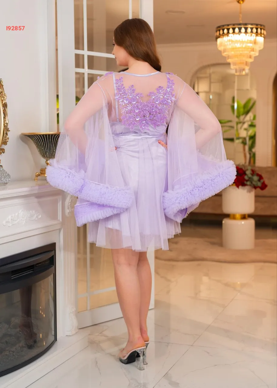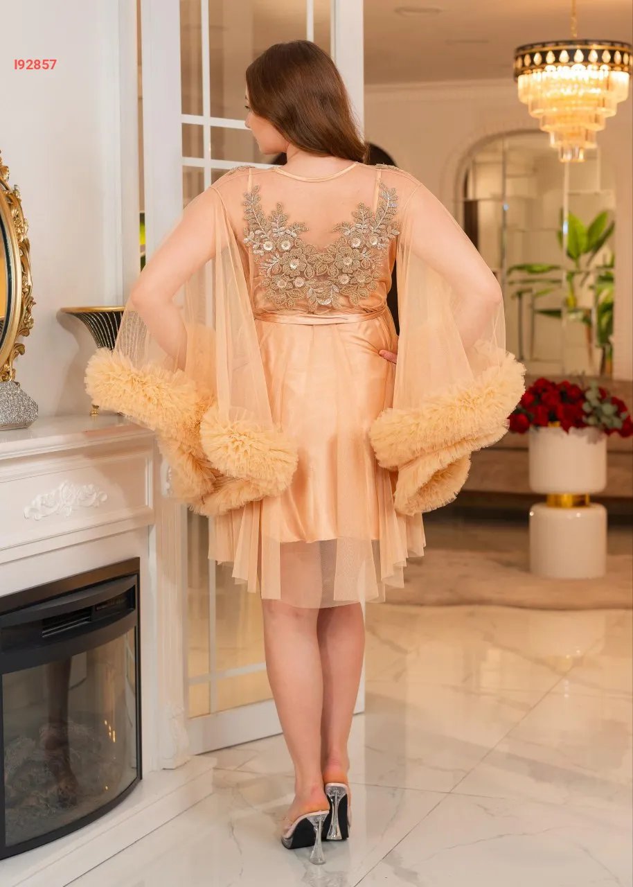 طقم صبحلك قصير ساتان مع أكمام شيفون عريضة مرصعة بالكرستار و دانتيل المشكوك