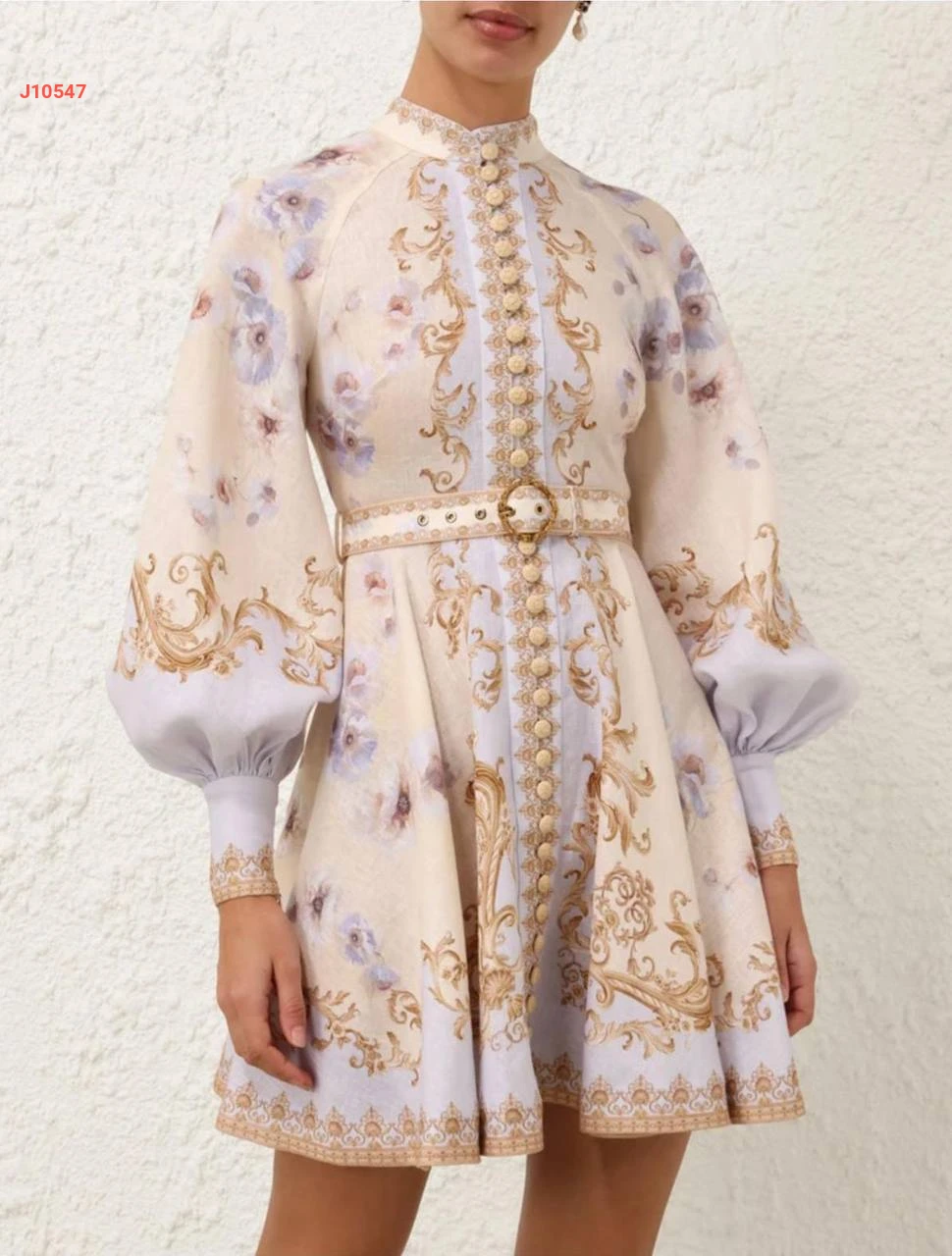 فستان قصير كتان منقوش بأكمام بالونية