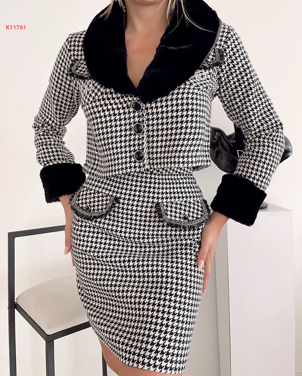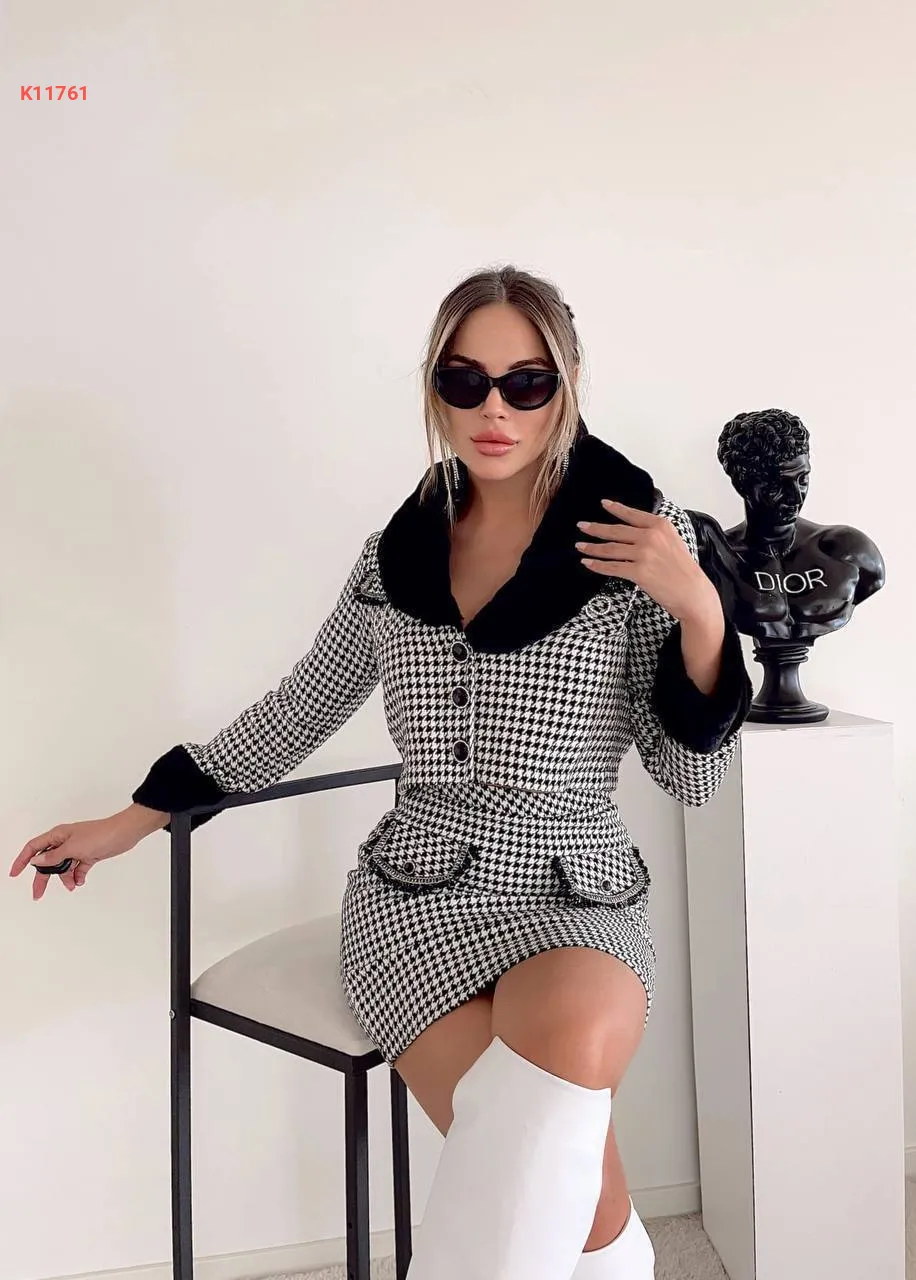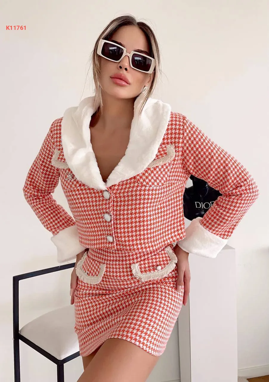 طقم تنورة قصير منقوش مع فرو
