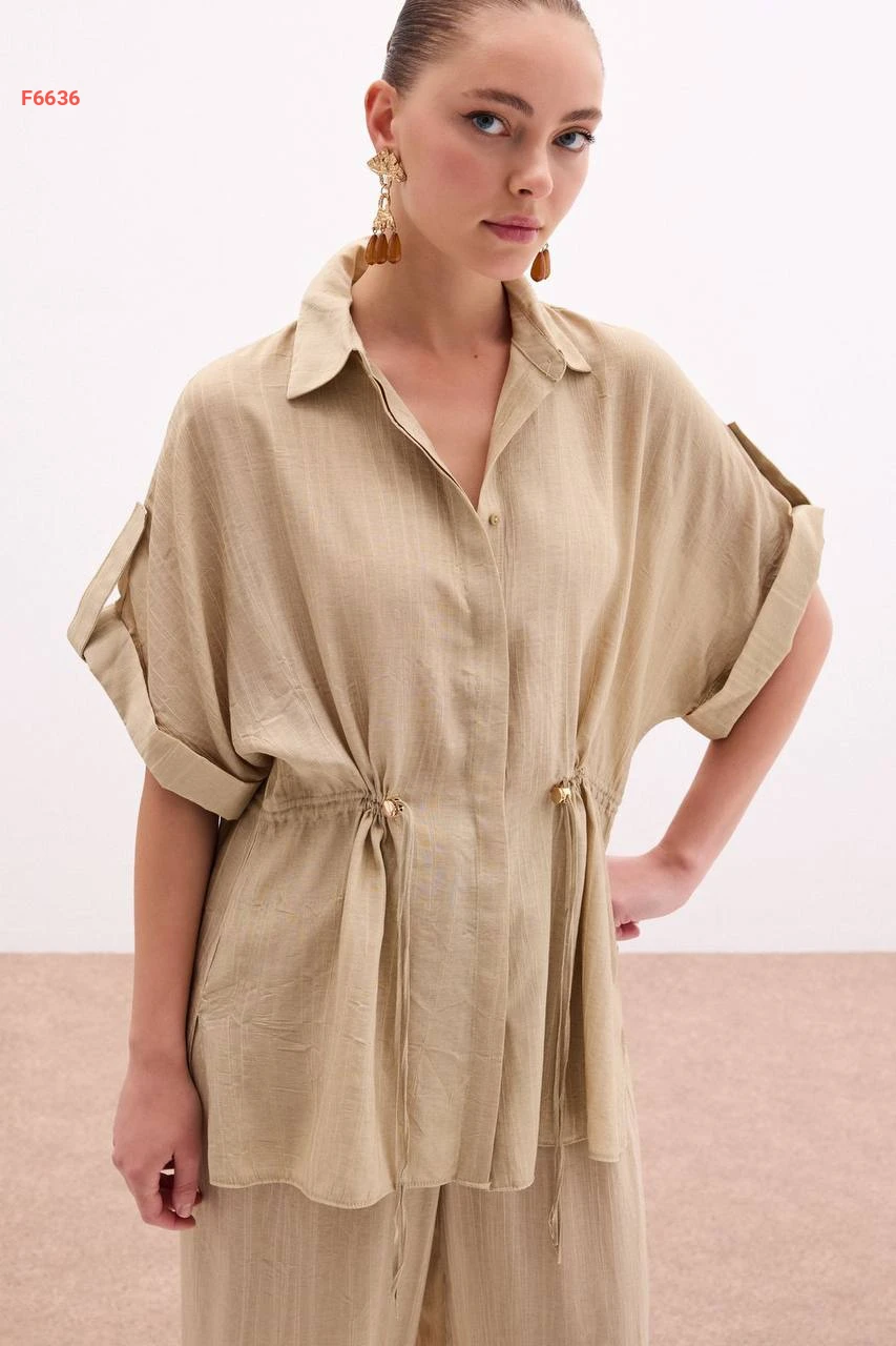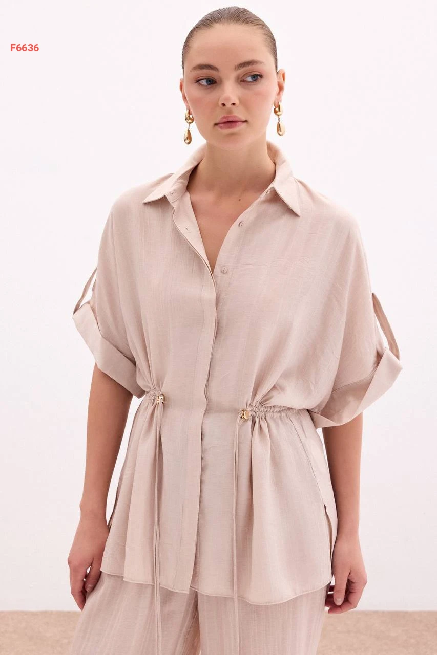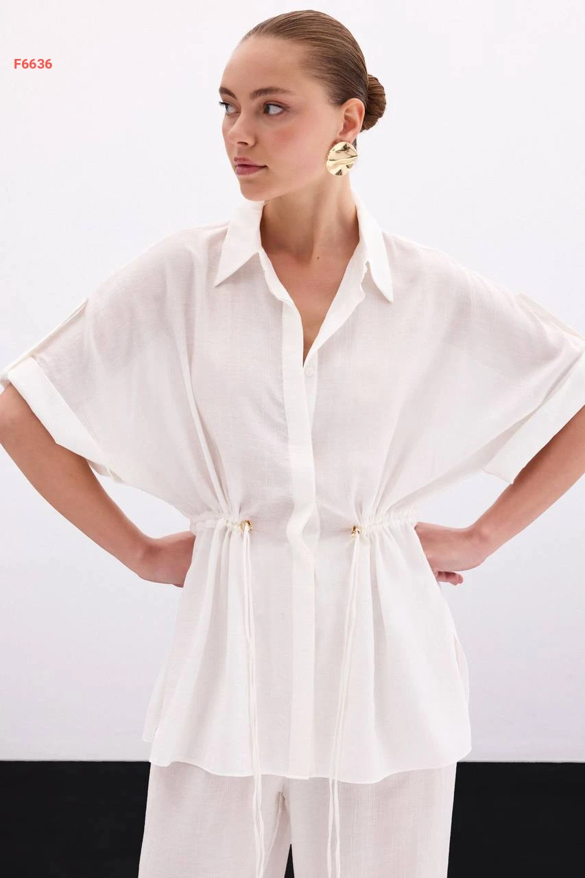 قميص زم عالخصر بأكمام قصيرة مطوية