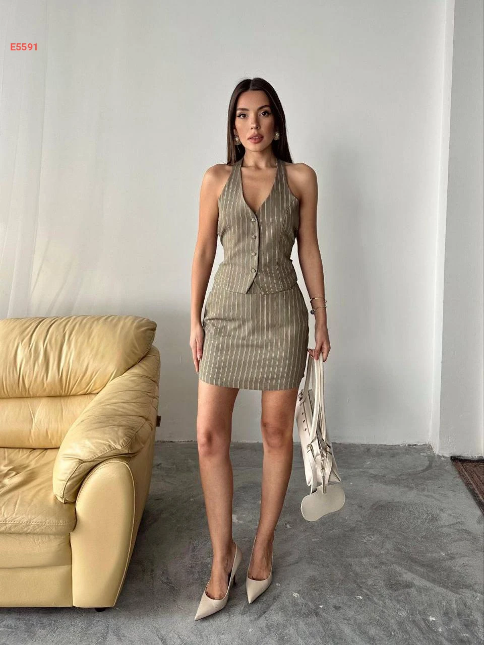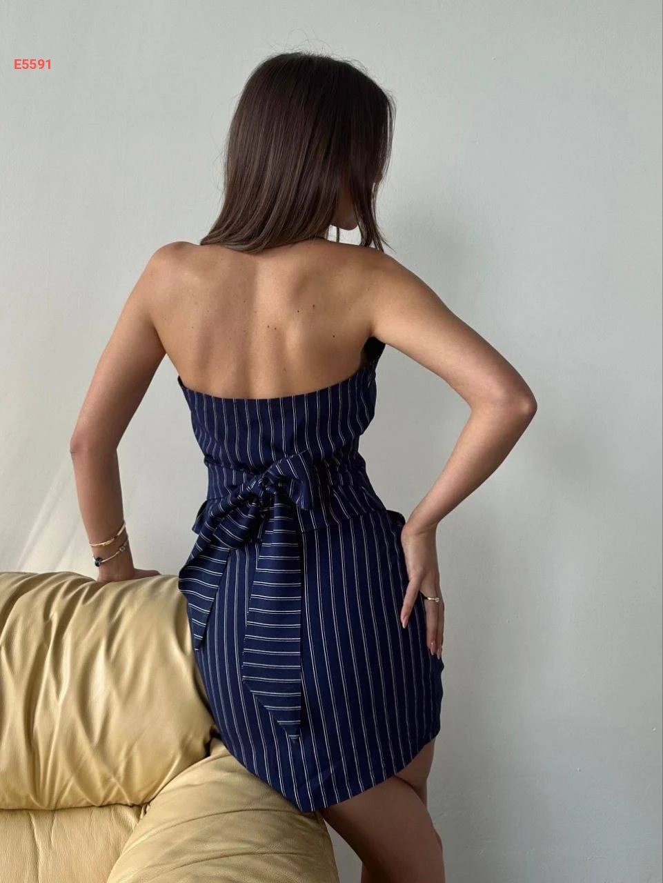 طقم تنورة قصير مقلم مع يلك بربطة خلفية