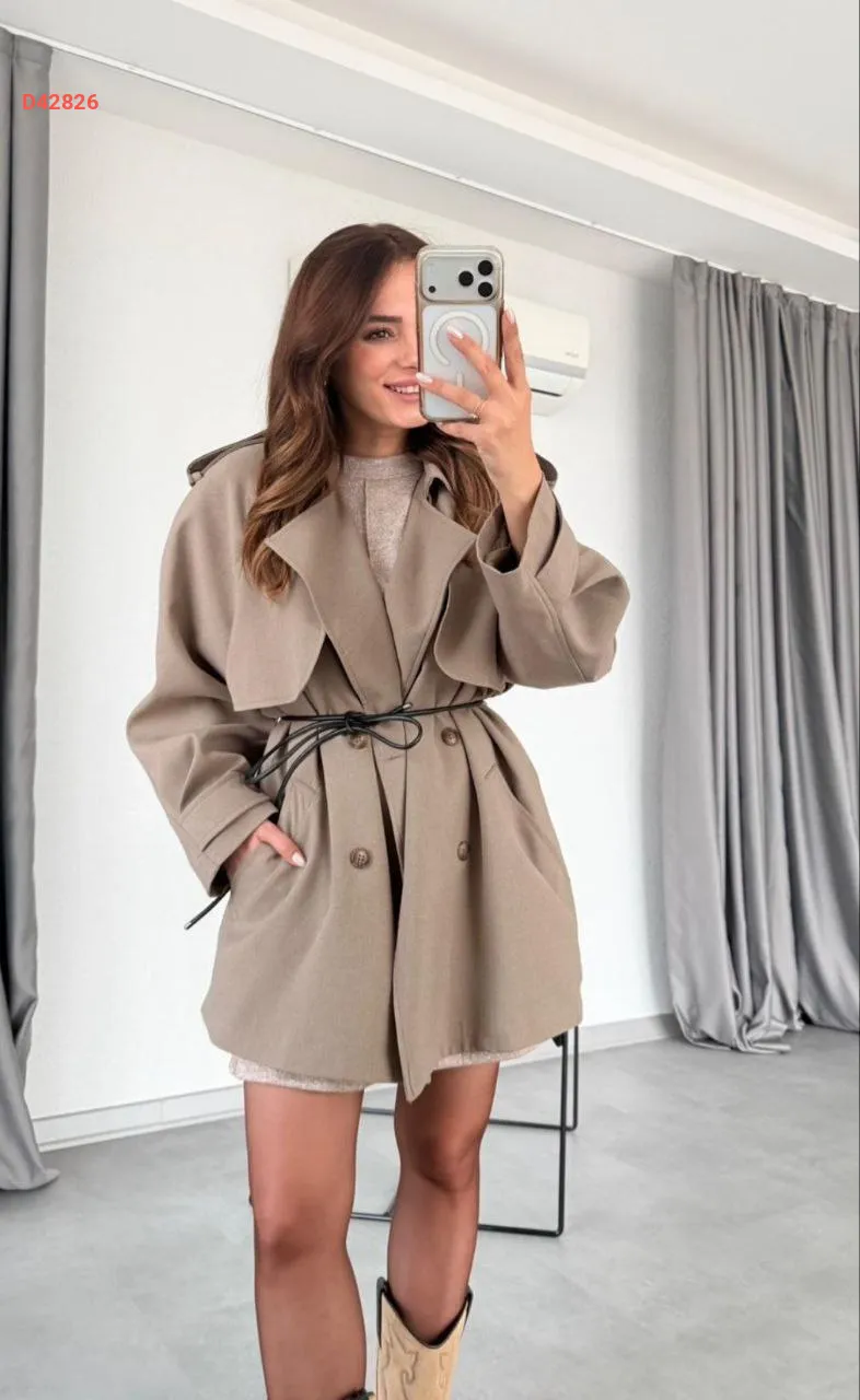 ترانشكوت قصير ، بأزرار مزدوجة، مع حزام , وجيب