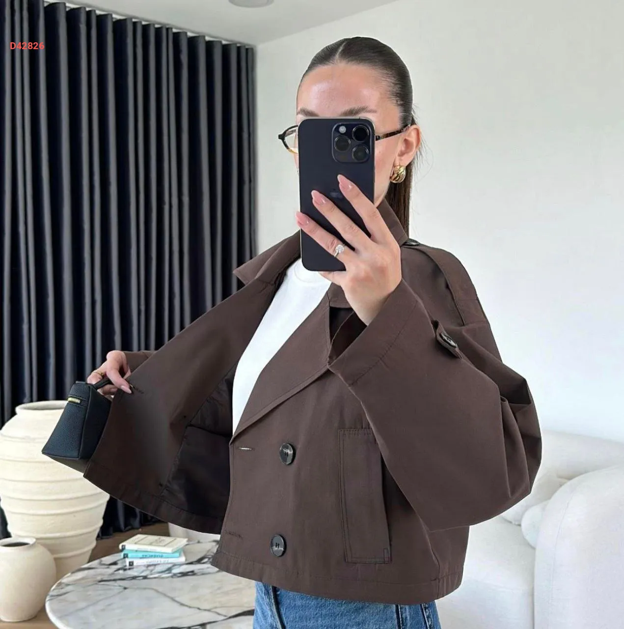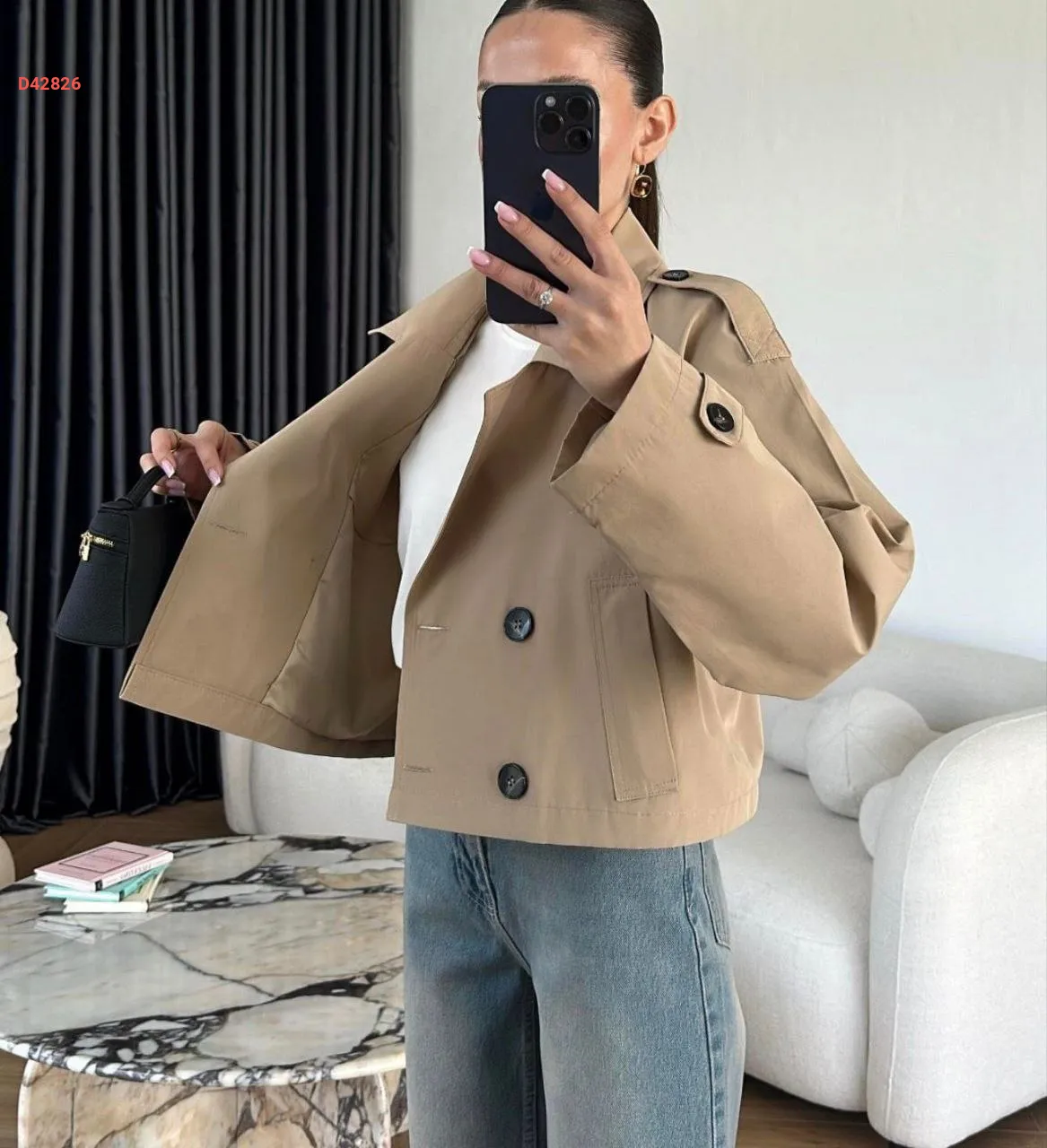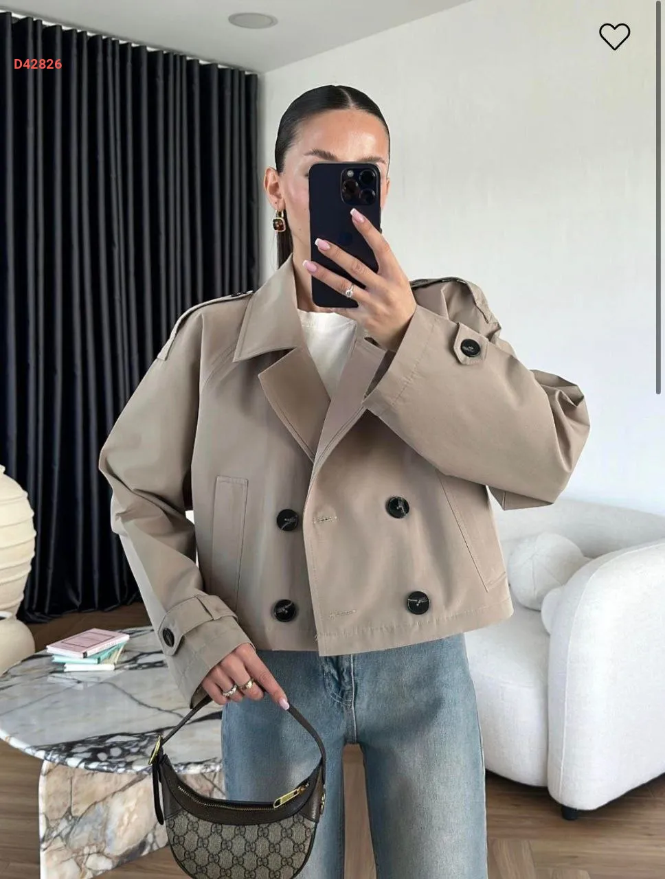 ترنشكوت قصير، مزدوج الصدر بأزرار، مع جيب
