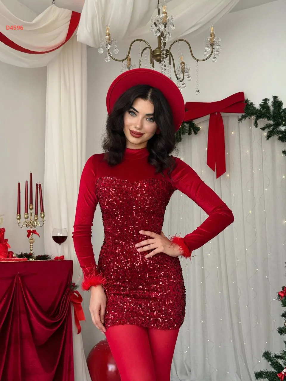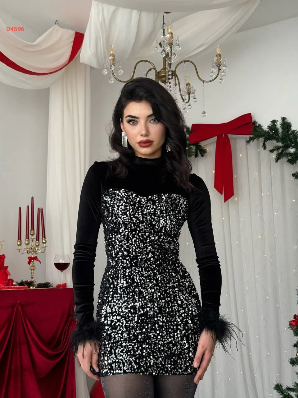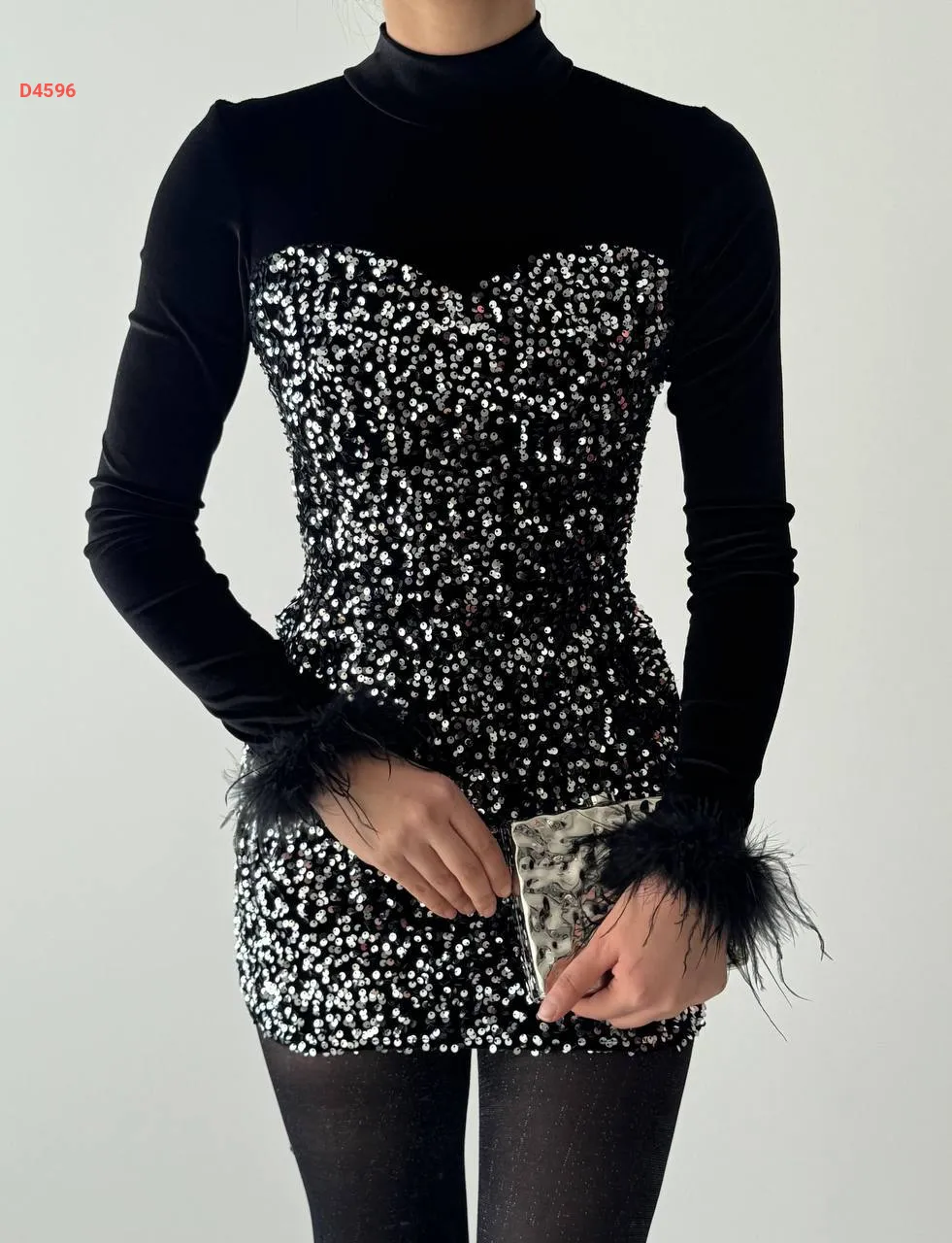 فستان قصير مخمل وباييت مع ريش عالكم