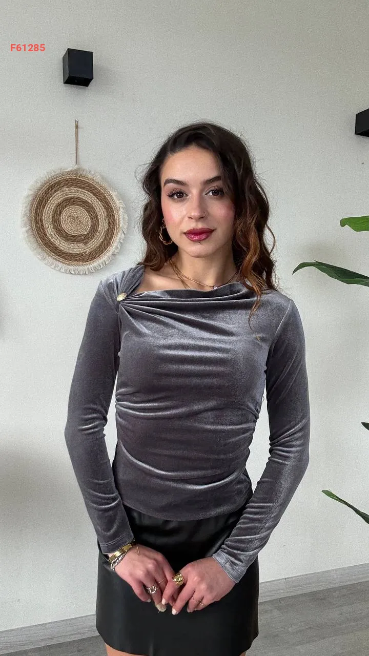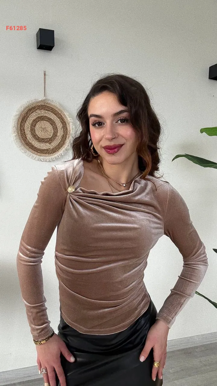 بلوزة مخمل مجمعة ببروش عالكتف