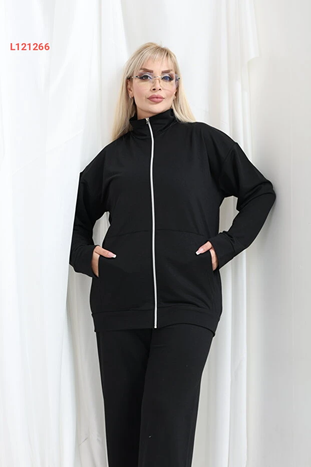 طقم رياضي للنساء بأكمام طويلة مع سحاب، تصميم مريح وزر عالي - مقاسات كبيرة